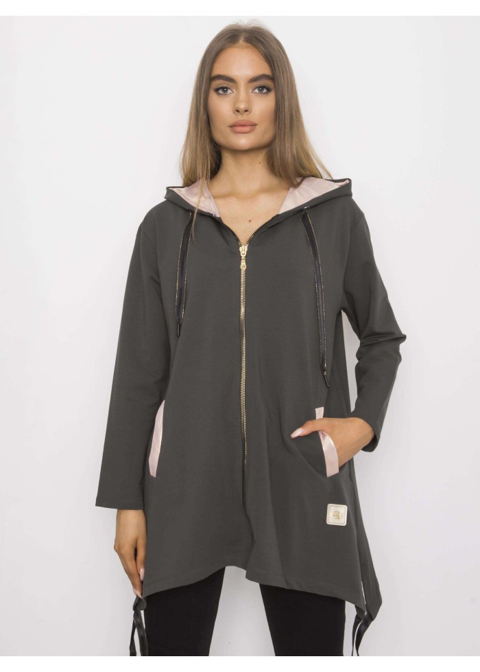 Asymetrická mikina s kapucňou, ozdobné šnúrky na kapucni, oversize strih, zapínanie na zips, podšívka kapucne v kontrastnej farbe, šnúrka v spodnej časti, lemy vreciek v kontrastnej farbe, spôsob prania: pranie v práčke na 30°c, materiál: 90% bavlna, 10% elastan, modelka má na sebe veľkosť s/m, miery modelky: výška: 176 cm, prsia: 86 cm, pás: 60 cm, boky: 88 cm, rozmer produktu meraného na plocho, vo veľkosti s/m:, šírka pod plecami: 50 cm, celková dĺžka: 74 cm, dĺžka rukávov: 60 cm.