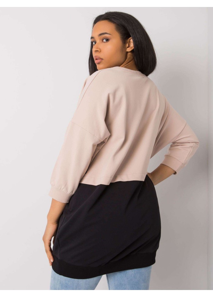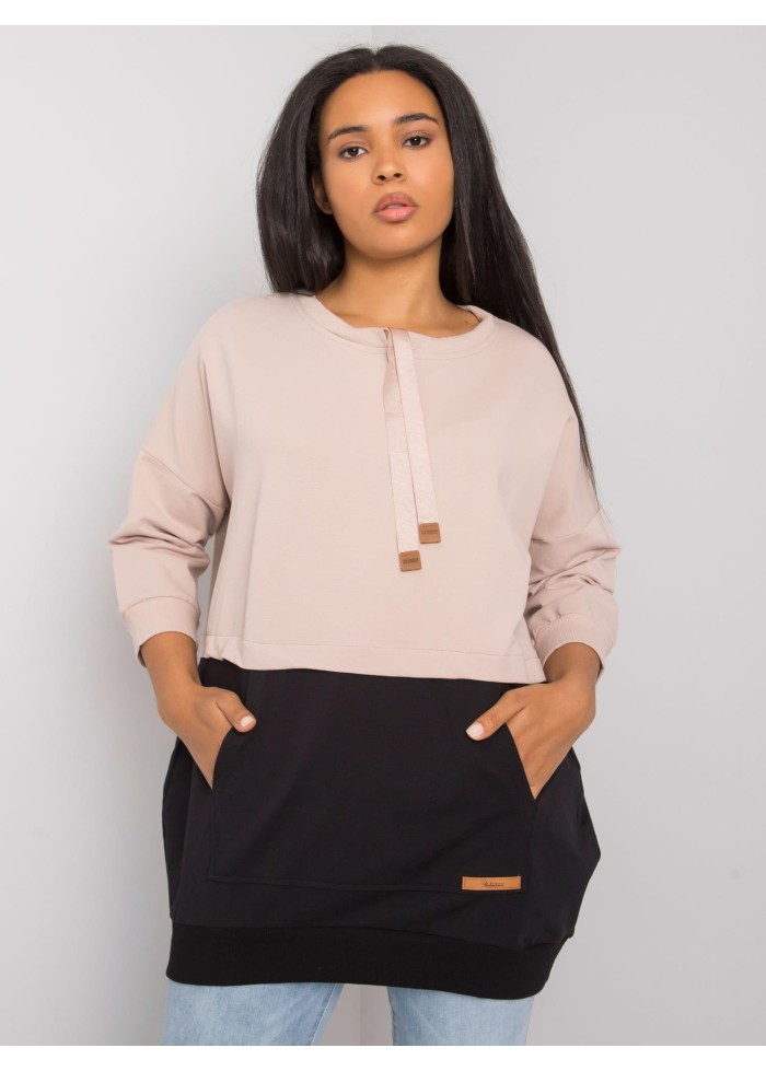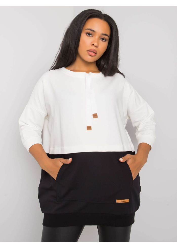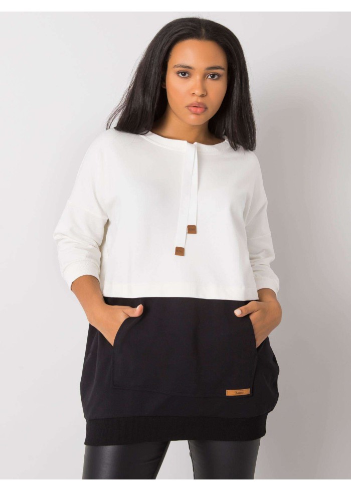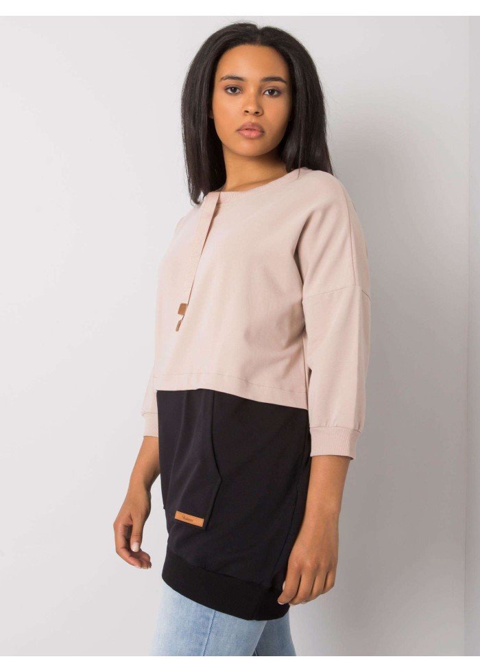 Dámska bavlnená tunika, tunika je prestrihnutá v páse, kontrastný spodný diel, okrúhly výstrih so šnúrkami, šnúrky ukončené koženou aplikáciou, 7/8 rukávy, klokanie vrecko s koženou aplikáciou, lémy na koncoch rukávov a v spodnej časti, univerzálna veľkosť, materiál: 90% bavlna, 10% elastan, spôsob prania: pranie v práčke na 30°c, modelka má oblečenú jednu veľkosť. miery modelky: výška 174 cm, prsia 108 cm, pás 87 cm, boky 116 cm., rozmery mikiny sú merané naplocho: šírka v podpazuší - 66 cm, celková dĺžka - 80 cm, dĺžka rukáva - 46 cm..