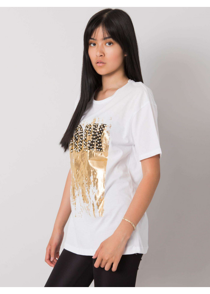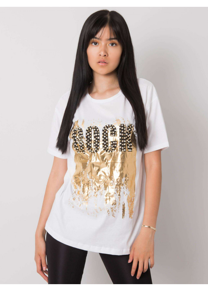 Dámske bavlnené tričko, krátky rukáv, okrúhly výstrih, potlač s kamienkami, perlami a cvočkami, materiál: 100% bavlna, spôsob prania: pranie v práčke na 30°c, modelka má na sebe veľkosť s. rozmery modelky: výška 174 cm, prsia 82 cm, pás 62 cm, boky 89 cm., rozmery trička vo veľkosti s merané naplocho: šírka v podpazuší - 50 cm, celková dĺžka - 64 cm.