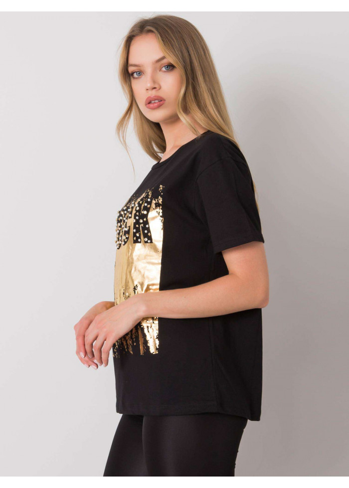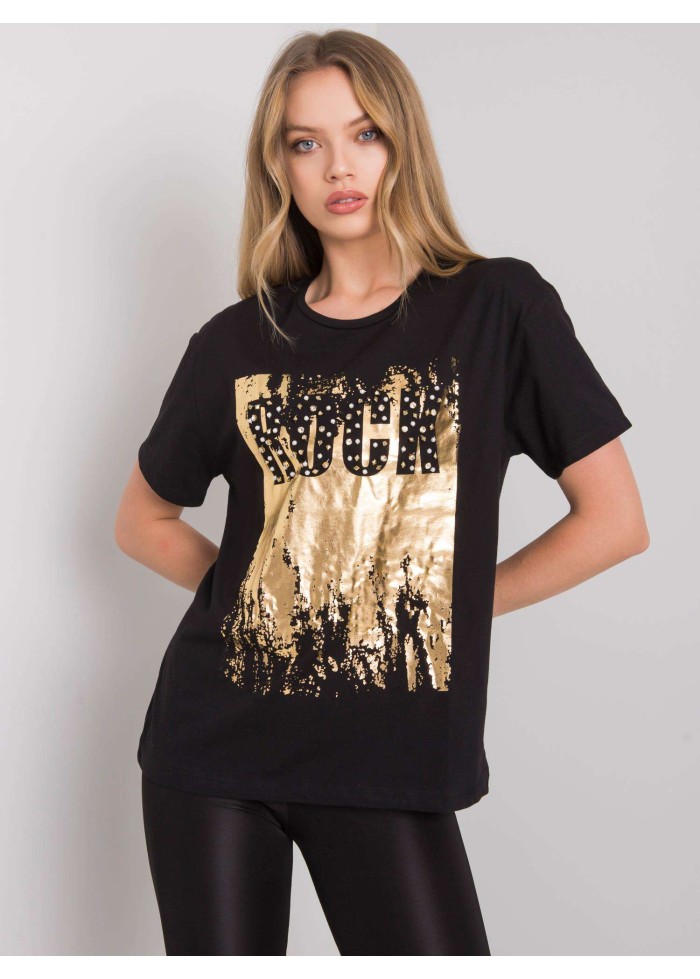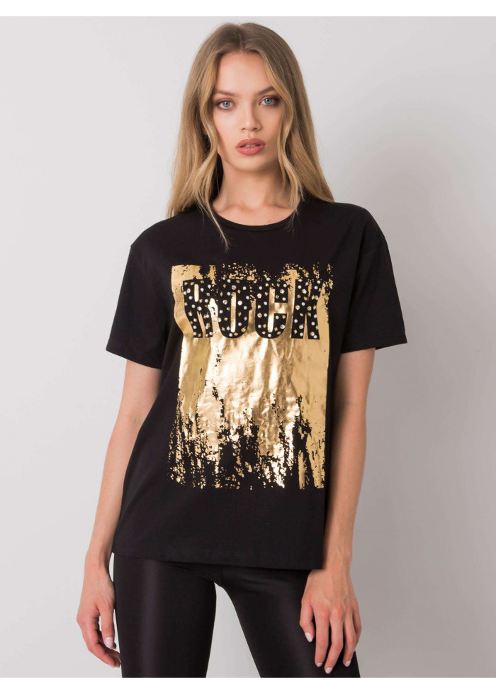 Dámske bavlnené tričko, krátky rukáv, okrúhly výstrih, potlač s kamienkami, perlami a cvočkami, materiál: 100% bavlna, spôsob prania: pranie v práčke na 30°c, modelka má na sebe veľkosť s. rozmery modelky: výška 174 cm, prsia 82 cm, pás 62 cm, boky 89 cm., rozmery trička vo veľkosti s merané naplocho: šírka v podpazuší - 50 cm, celková dĺžka - 64 cm.
