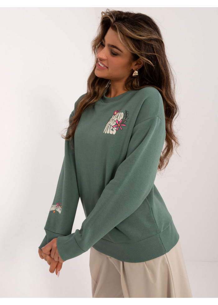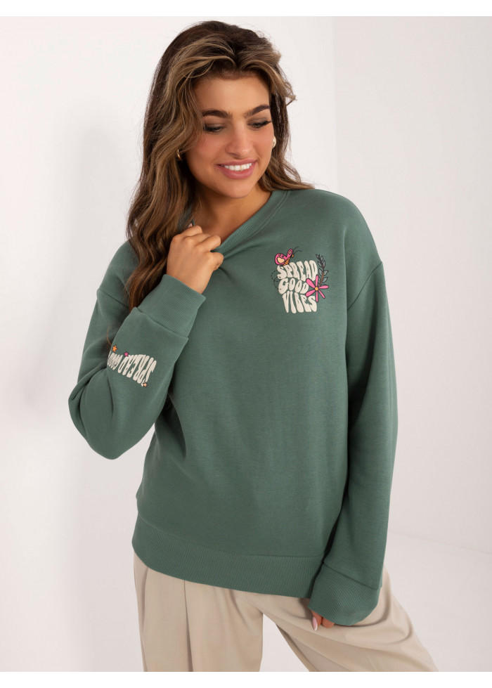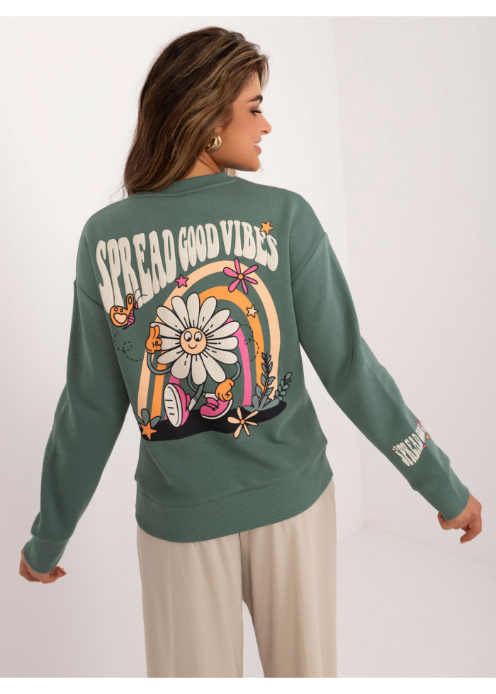 Dámska mikina s potlačou, okrúhly dekolt pri krku, dlhé rukavy ukončené lémom, ozdobná potlač vpredu v ľavej časti a vzadu na chrbte, široký lém v spodnej časti, modelka má na sebe veľkosť s, rozmery modelky: výška 173 cm, prsia 90 cm, pás 64 cm, boky 91 cm, rozmer produktu meraného na plocho, vo veľkosti s:, šírka v podpazuší - 54 cm, celková dĺžka - 63 cm, dĺžka rukáva - 61 cm.