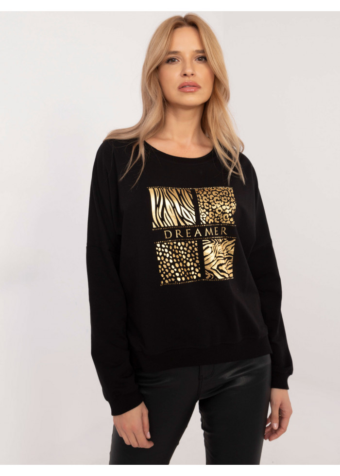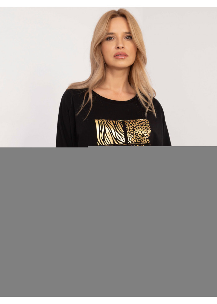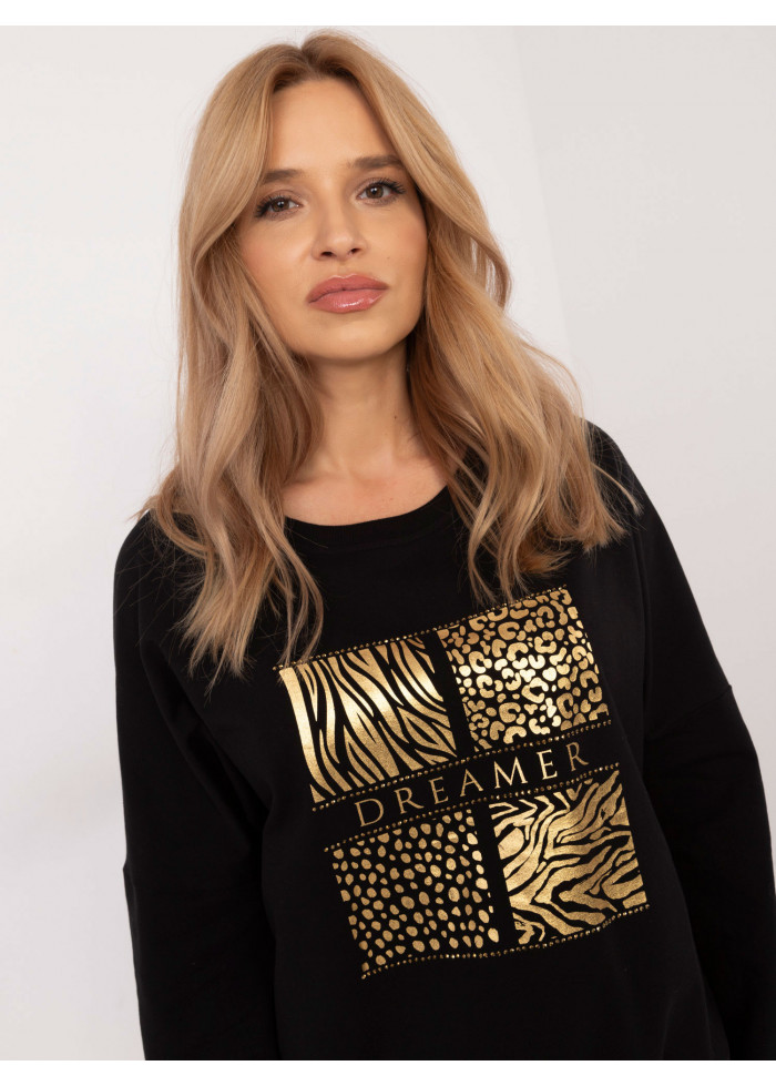Dámska predĺžená mikina, mikina s okrúhlym výstrihom, asymetrická zadná časť, zlatá potlač na prednej strane, dlhé rukavy ukončené lémom, decentné rozparky na bokoch, pás na chrbte, modelka má na sebe veľkosť s, miery modelky: výška 175 cm, prsia 90 cm, pás 66 cm, boky 94 cm, rozmer produktu meraného na plocho, vo veľkosti s:, šírka v podpazuší - 65 cm, dĺžka blúzky - 63 cm (predný diel), dĺžka blúzky - 66 cm (zadný diel), dĺžka rukáva - 41 cm (od švu).
