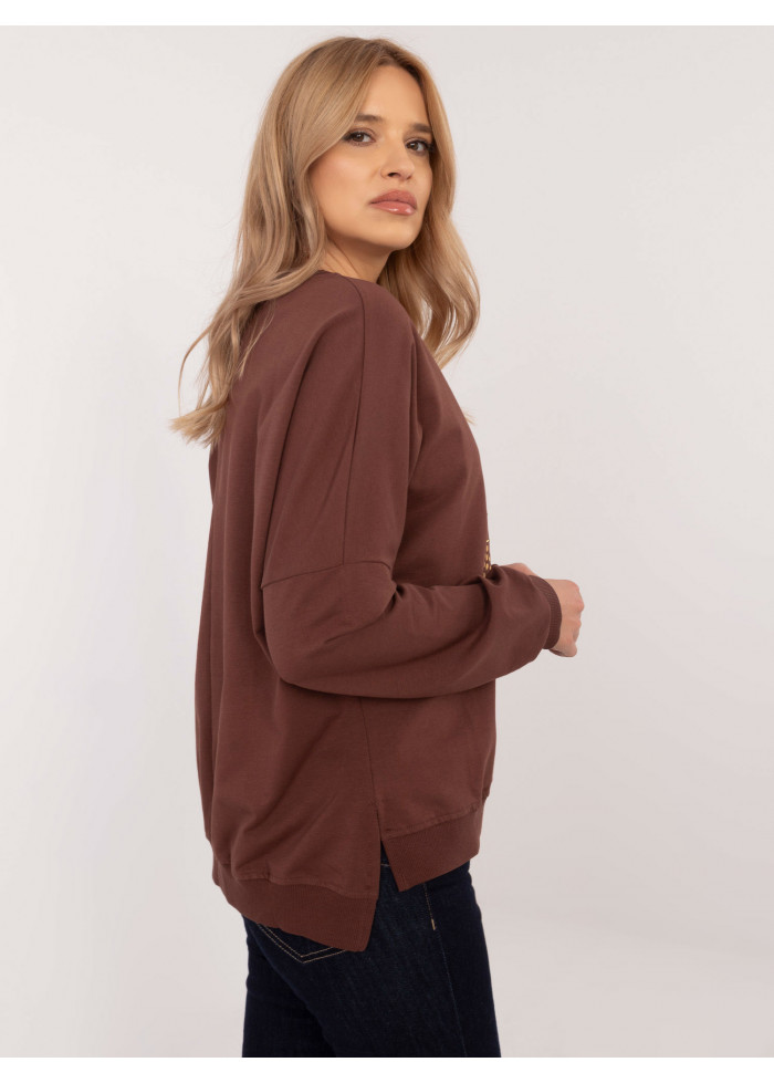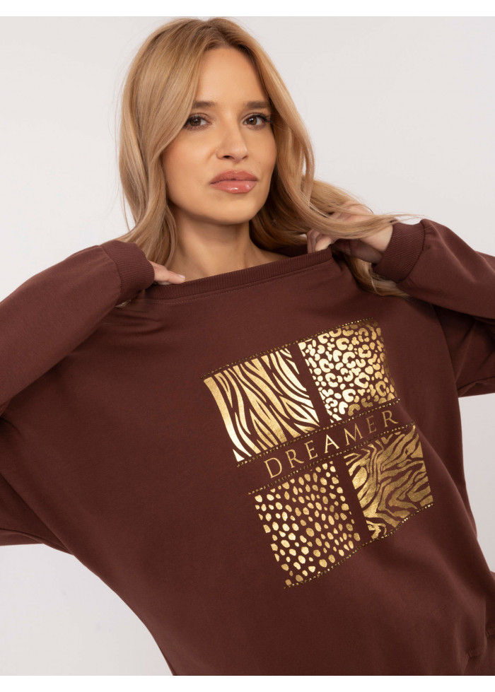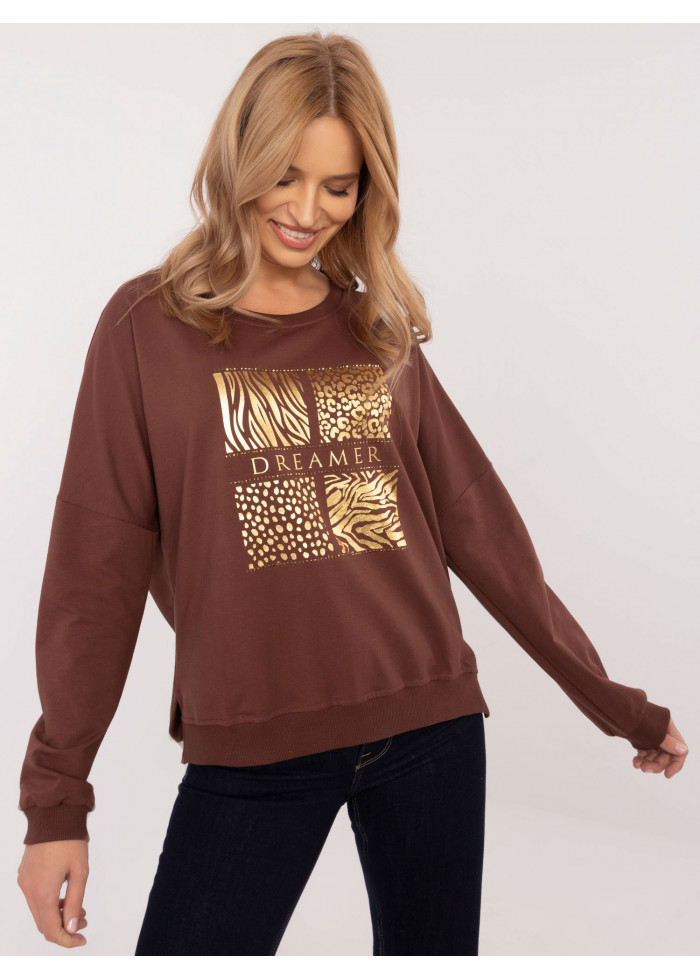 Dámska predĺžená mikina, mikina s okrúhlym výstrihom, asymetrická zadná časť, zlatá potlač na prednej strane, dlhé rukavy ukončené lémom, decentné rozparky na bokoch, pás na chrbte, modelka má na sebe veľkosť s, miery modelky: výška 175 cm, prsia 90 cm, pás 66 cm, boky 94 cm, rozmer produktu meraného na plocho, vo veľkosti s:, šírka v podpazuší - 65 cm, dĺžka blúzky - 63 cm (predný diel), dĺžka blúzky - 66 cm (zadný diel), dĺžka rukáva - 41 cm (od švu).
