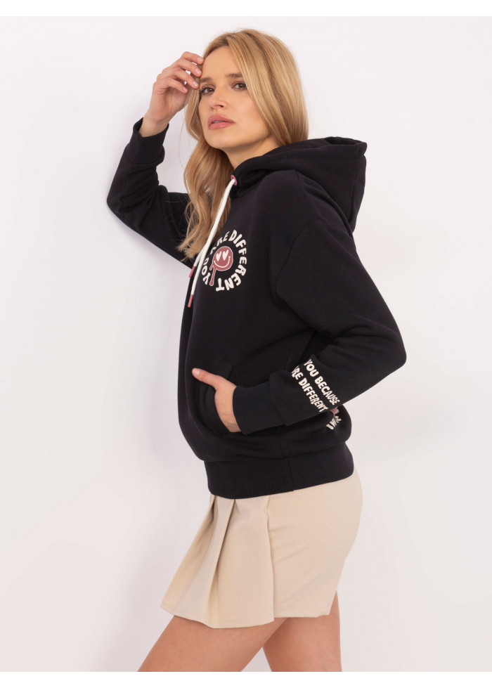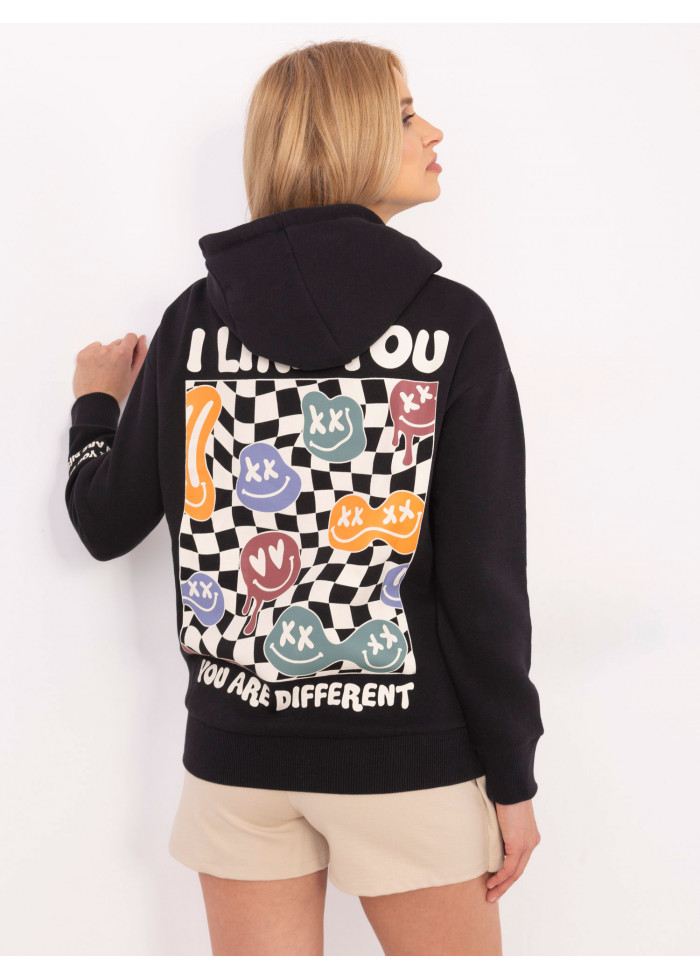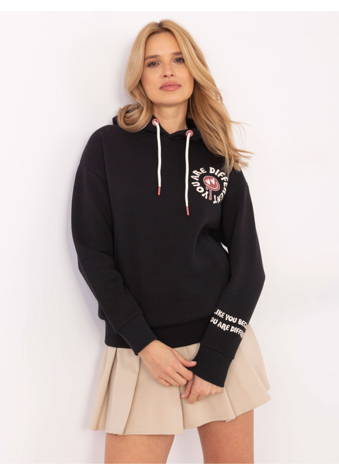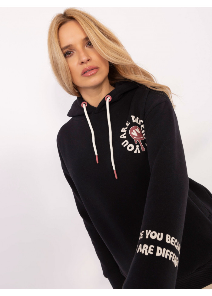 Dámska mikina s kapucňou, kontrastné šnúrky na kapucni, ozdobná potlač na rukáve, potlač v prednej časti, potlač vzadu, lémy na koncoch rukávov a v spodnej časti, modelka má na sebe veľkosť s, miery modelky: výška 175 cm, prsia 90 cm, pás 66 cm, boky 94 cm, rozmer produktu meraného na plocho, vo veľkosti s:, šírka v podpazuší - 57 cm, celková dĺžka - 64 cm, dĺžka rukáva - 54 cm (od švu).