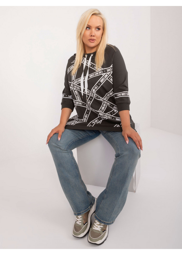 Asymetrická dámska tunika, okrúhly výstrih s ozdobnými šnúrkami, 3/4 rukávy s lémom, kontrastná potlač, kontrastná potlač aj na rukávoch, rozparky na bokoch, modelka má na sebe univerzálnu veľkosť, miery modelky: výška 172 cm, prsia 103 cm, pás 73 cm, boky 103 cm., rozmer produktu meraného na plocho:, šírka pod pazuchami - 63 cm, dĺžka rukáva - 43 cm, celková dĺžka (vpredu) - 70 cm, celková dĺžka (vzadu) - 85 c.