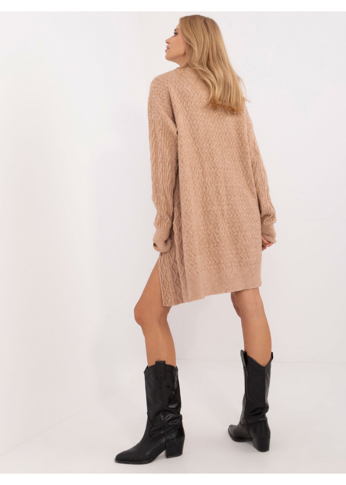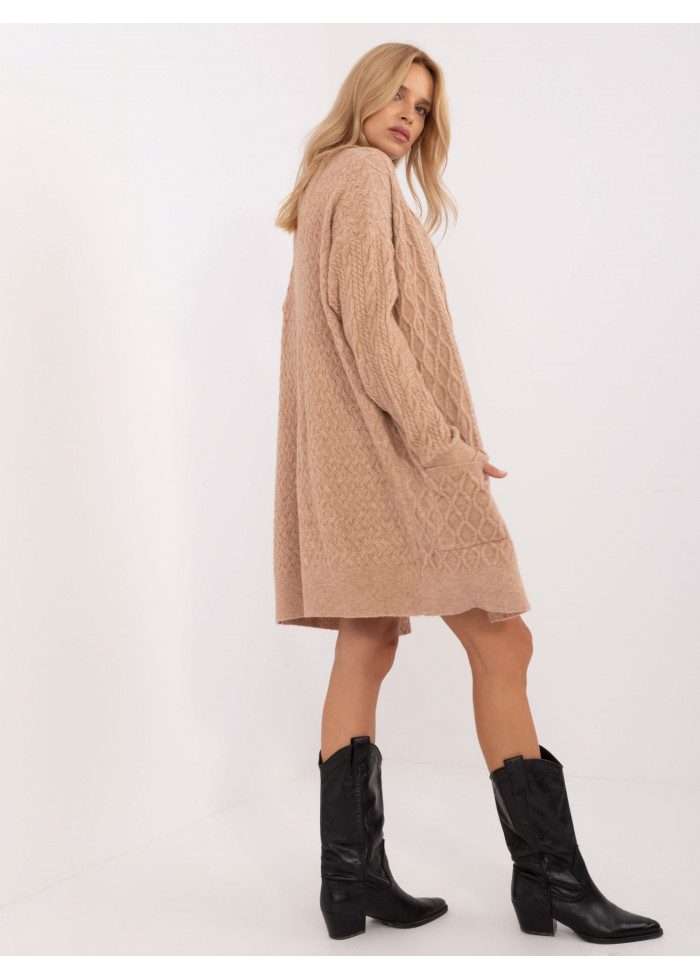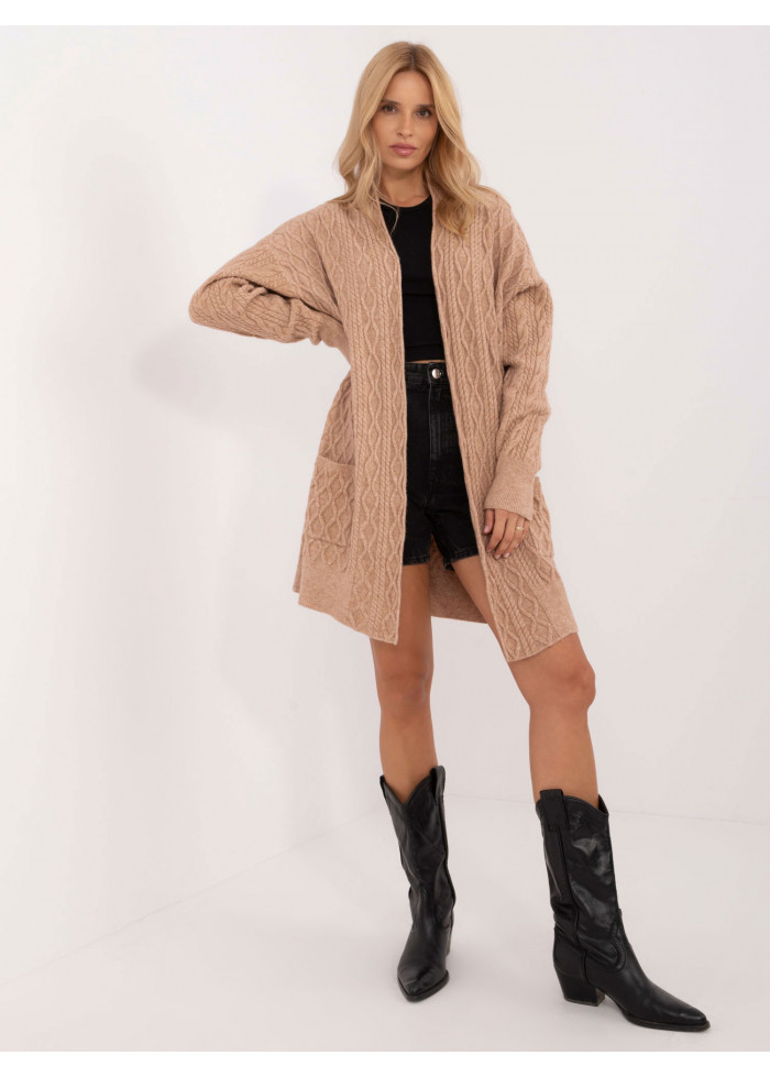 Dámsky dlhý pletený kardigán, dlhé rukávy s lémom, 2 bočné vrecká, široký lém v spodnej časti, modelka má na sebe univerzálnu veľkosť, miery modelky: výška 175 cm, prsia 90 cm, pás 66 cm, boky 94 cm, rozmer produktu meraného na plocho:, šírka pod pazuchami - 68 cm, dĺžka rukáva - 64 cm, celková dĺžka - 90 cm.