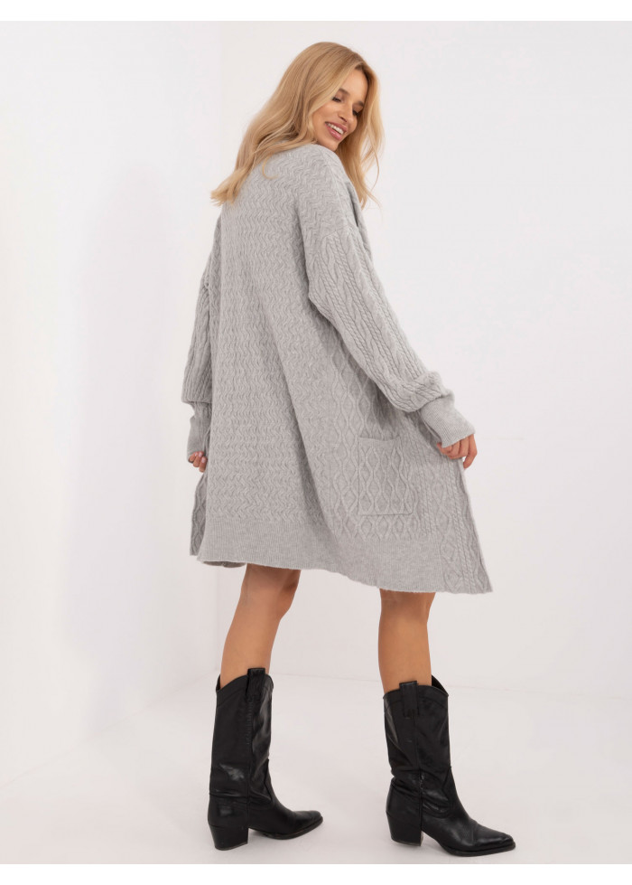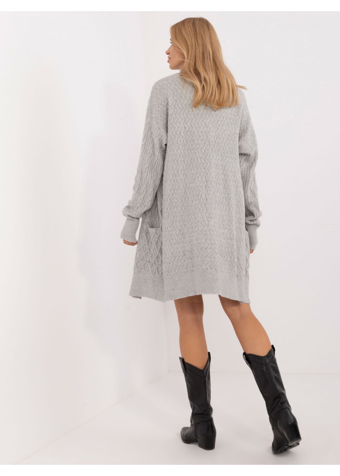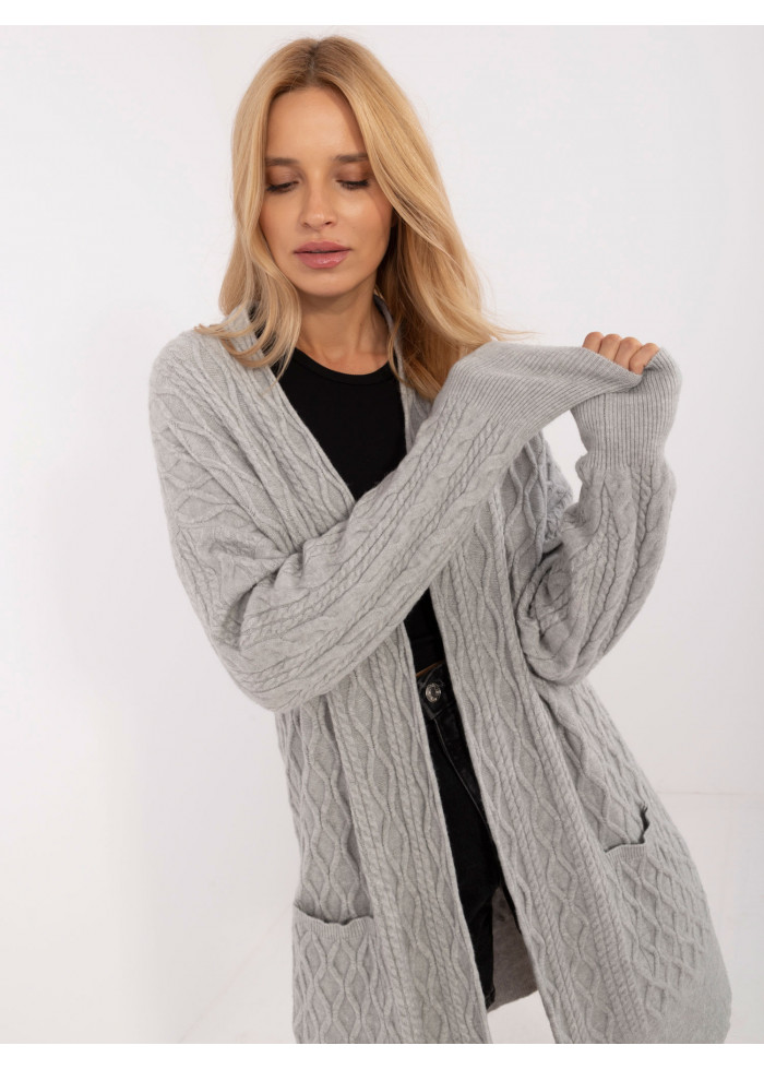 Dámsky dlhý pletený kardigán, dlhé rukávy s lémom, 2 bočné vrecká, široký lém v spodnej časti, modelka má na sebe univerzálnu veľkosť, miery modelky: výška 175 cm, prsia 90 cm, pás 66 cm, boky 94 cm, rozmer produktu meraného na plocho:, šírka pod pazuchami - 68 cm, dĺžka rukáva - 64 cm, celková dĺžka - 90 cm.