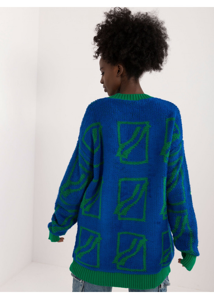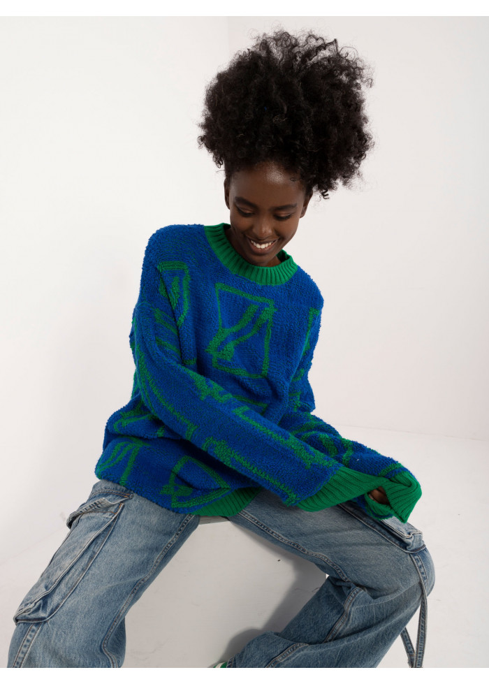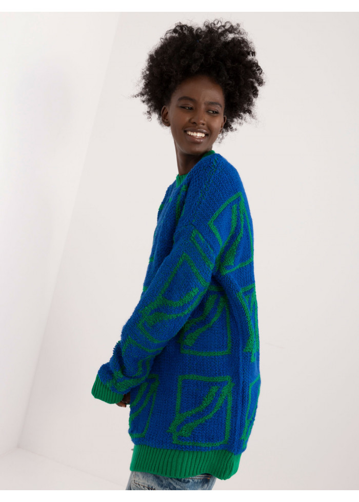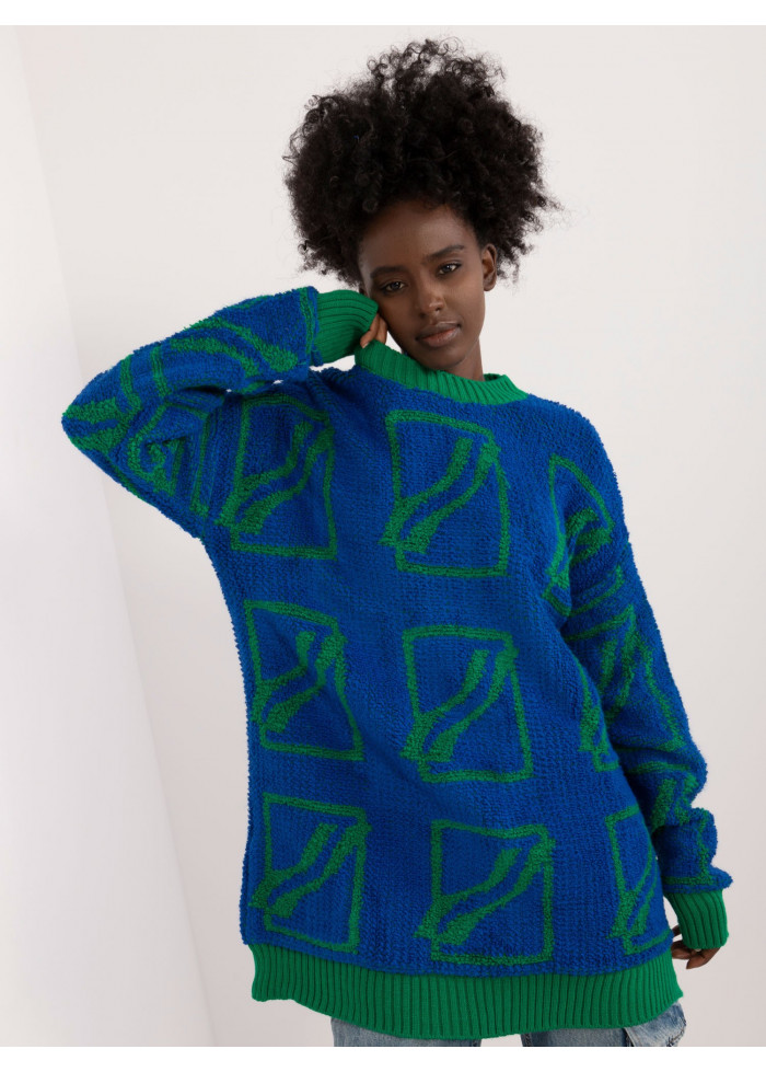Dámsky oversize sveter, zaujímavý vzor, okrúhly výstrih, voľný predlžený strih, kontrastné lemovanie, modelka má na sebe univerzálnu veľkosť, miery modelky: výška: 168 cm, prsia: 82 cm, pás: 62 cm, boky: 93 cm, rozmer produktu meraného na plocho:, šírka svetra pod pazuchami - 58 cm, dĺžka svetra - 82 cm, dĺžka rukáva - 71 cm.