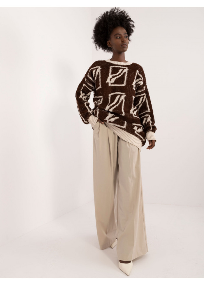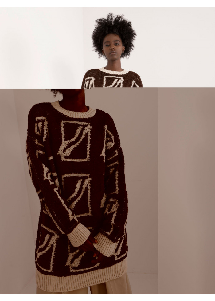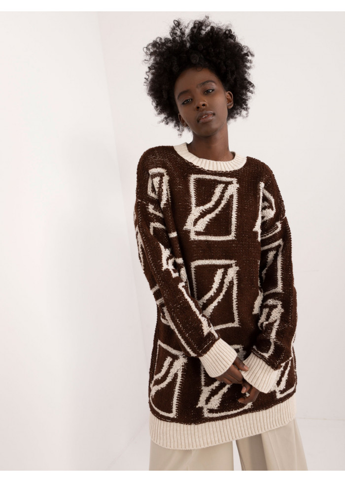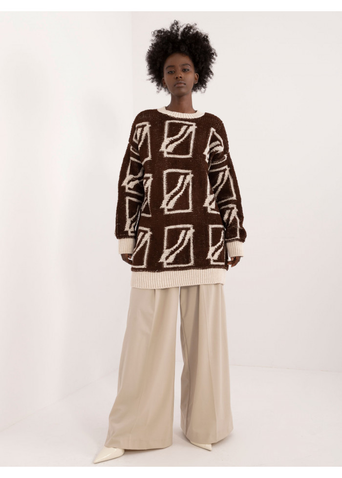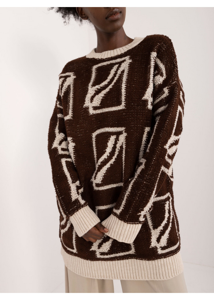 Dámsky oversize sveter, zaujímavý vzor, okrúhly výstrih, voľný predlžený strih, kontrastné lemovanie, modelka má na sebe univerzálnu veľkosť, miery modelky: výška: 168 cm, prsia: 82 cm, pás: 62 cm, boky: 93 cm, rozmer produktu meraného na plocho:, šírka svetra pod pazuchami - 58 cm, dĺžka svetra - 82 cm, dĺžka rukáva - 71 cm.