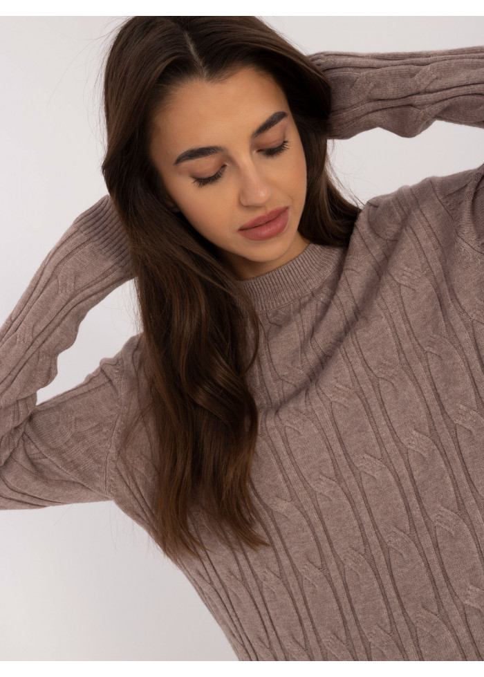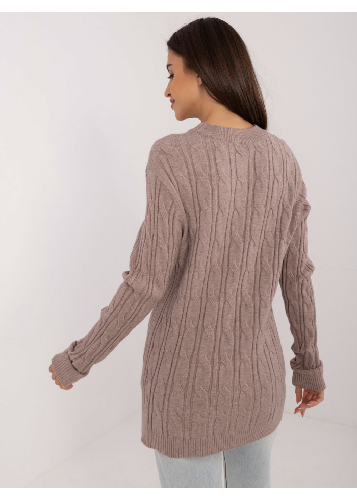 Dámsky sveter, módny predlžený strih, zaujímavý pletený vzor, okrúhly výstrih s hrubším lemovaním, modelka má na sebe univerzálnu veľkosť, miery modelky: výška 175 cm, prsia 90 cm, pás 66 cm, boky 94 cm, rozmer produktu meraného na plocho:, šírka pod pazuchami - 55 cm, dĺžka rukáva - 62 cm, celková dĺžka - 74 cm.
