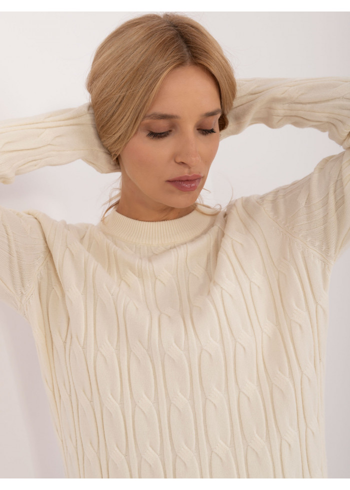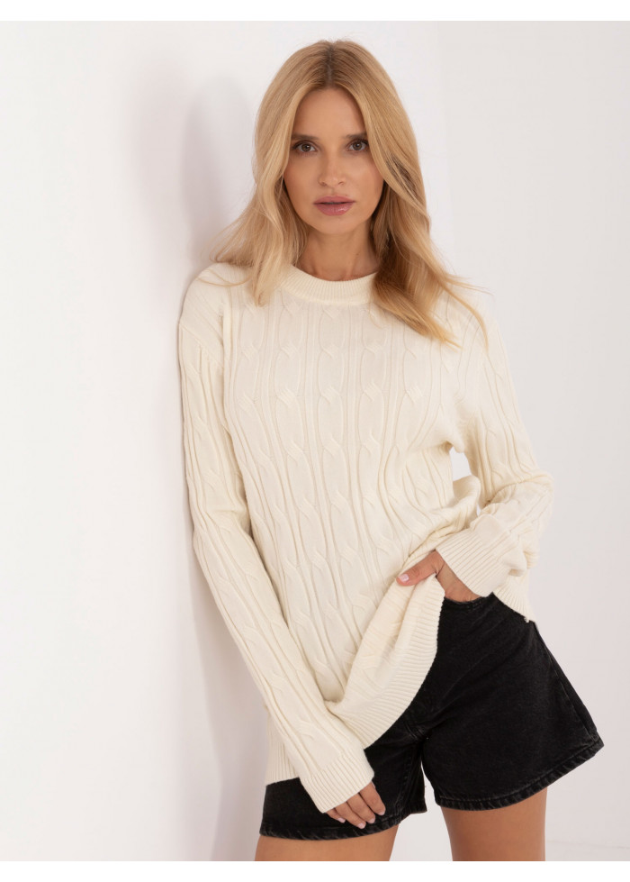 Dámsky sveter, módny predlžený strih, zaujímavý pletený vzor, okrúhly výstrih s hrubším lemovaním, modelka má na sebe univerzálnu veľkosť, miery modelky: výška 175 cm, prsia 90 cm, pás 66 cm, boky 94 cm, rozmer produktu meraného na plocho:, šírka pod pazuchami - 55 cm, dĺžka rukáva - 62 cm, celková dĺžka - 74 cm.