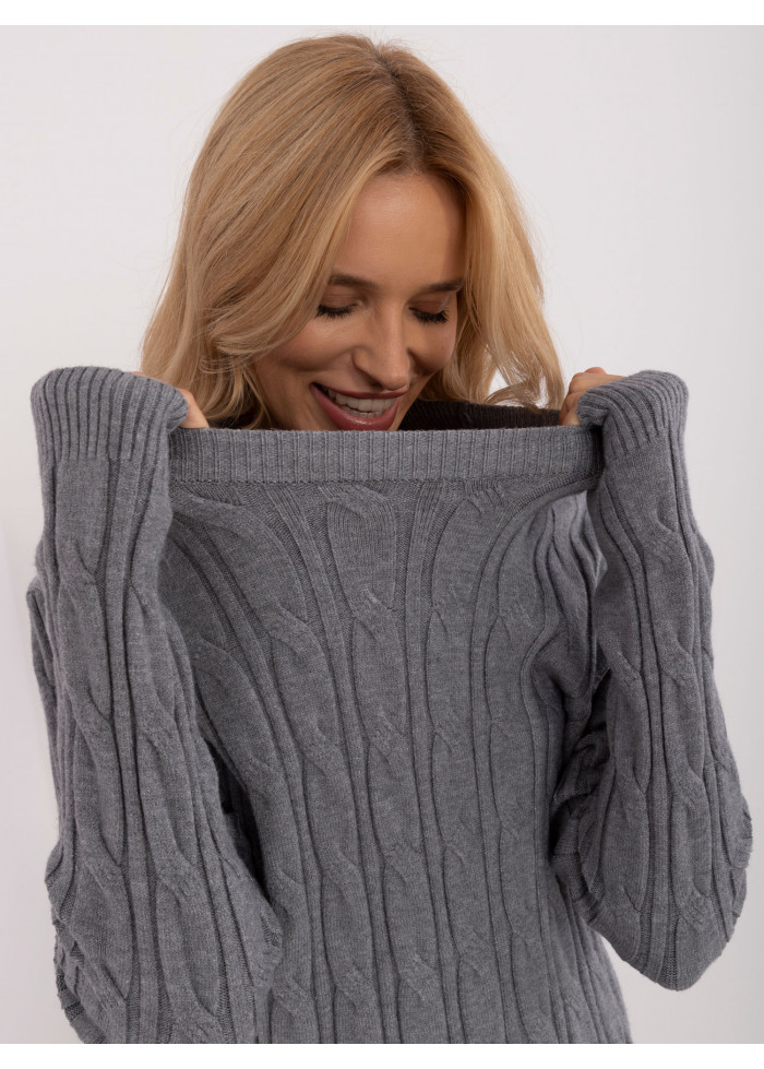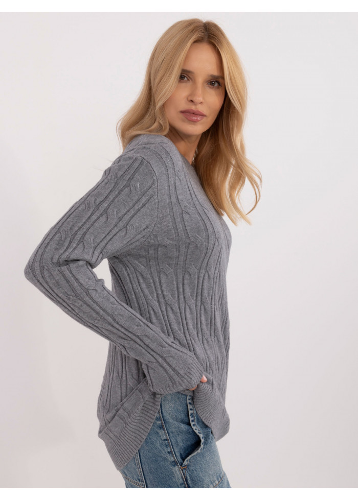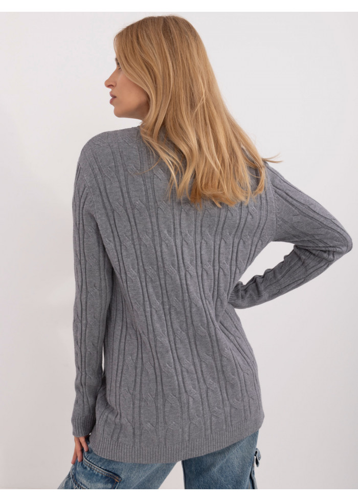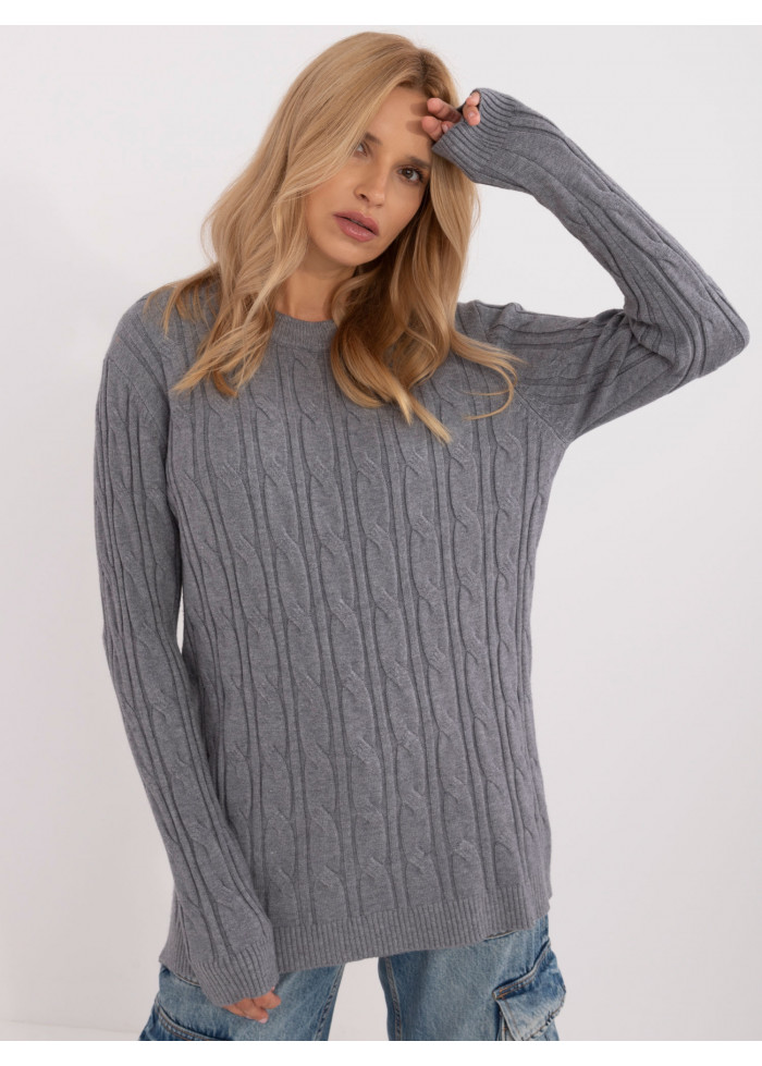 Dámsky sveter, módny predlžený strih, zaujímavý pletený vzor, okrúhly výstrih s hrubším lemovaním, modelka má na sebe univerzálnu veľkosť, miery modelky: výška 175 cm, prsia 90 cm, pás 66 cm, boky 94 cm, rozmer produktu meraného na plocho:, šírka pod pazuchami - 55 cm, dĺžka rukáva - 62 cm, celková dĺžka - 74 cm.