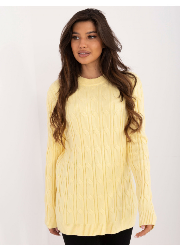 Dámsky sveter, módny predlžený strih, zaujímavý pletený vzor, okrúhly výstrih s hrubším lemovaním, modelka má na sebe univerzálnu veľkosť, miery modelky: výška 175 cm, prsia 90 cm, pás 66 cm, boky 94 cm, rozmer produktu meraného na plocho:, šírka pod pazuchami - 55 cm, dĺžka rukáva - 62 cm, celková dĺžka - 74 cm.