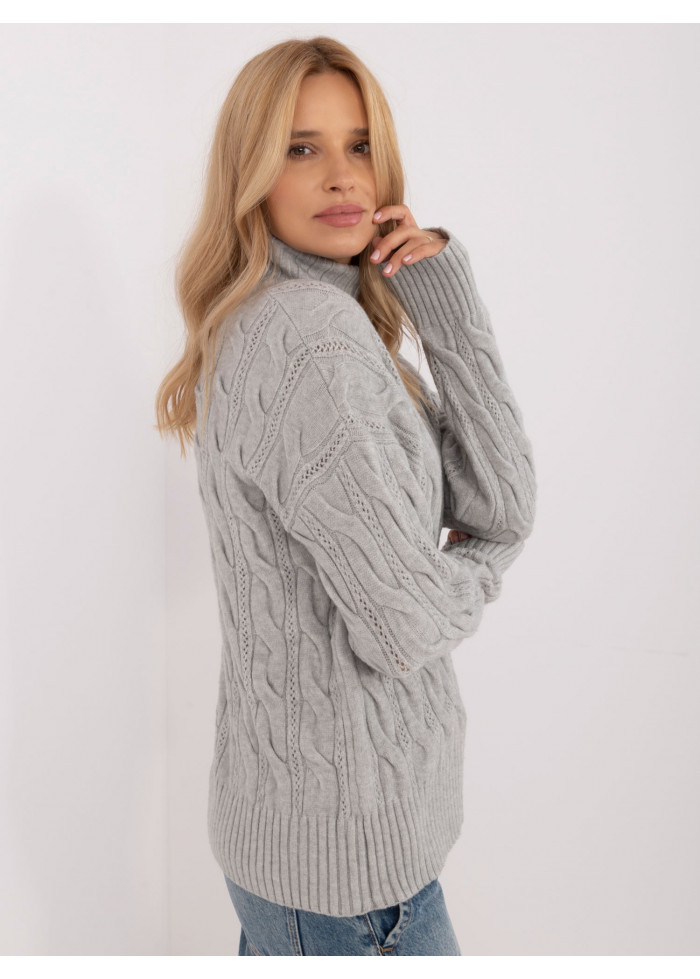 Dámsky pletený rolák, zaujímavý pletený vzor, golier a lemy na rukávoch z rebrovej pleteniny, modelka má na sebe univerzálnu veľkosť, miery modelky: výška: 173 cm, prsia: 89 cm, pás: 65 cm, boky: 91 cm, rozmer produktu meraného na plocho:, šírka pod pazuchami - 60 cm, dĺžka rukáva - 60 cm, celková dĺžka - 64 cm.