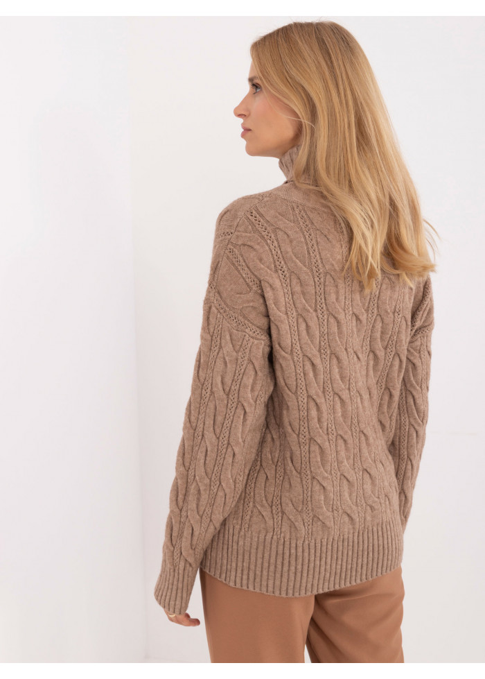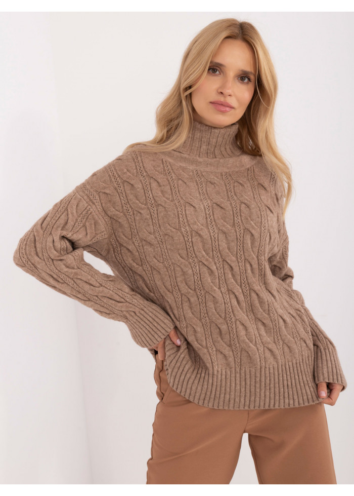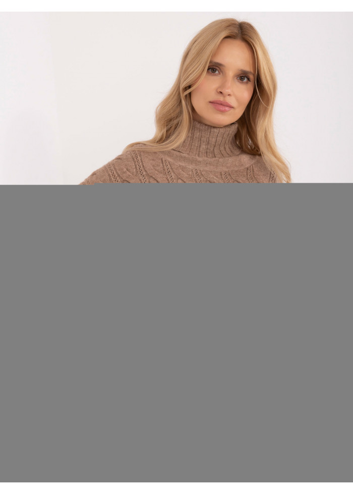 Dámsky pletený rolák, zaujímavý pletený vzor, golier a lemy na rukávoch z rebrovej pleteniny, modelka má na sebe univerzálnu veľkosť, miery modelky: výška: 173 cm, prsia: 89 cm, pás: 65 cm, boky: 91 cm, rozmer produktu meraného na plocho:, šírka pod pazuchami - 60 cm, dĺžka rukáva - 60 cm, celková dĺžka - 64 cm.