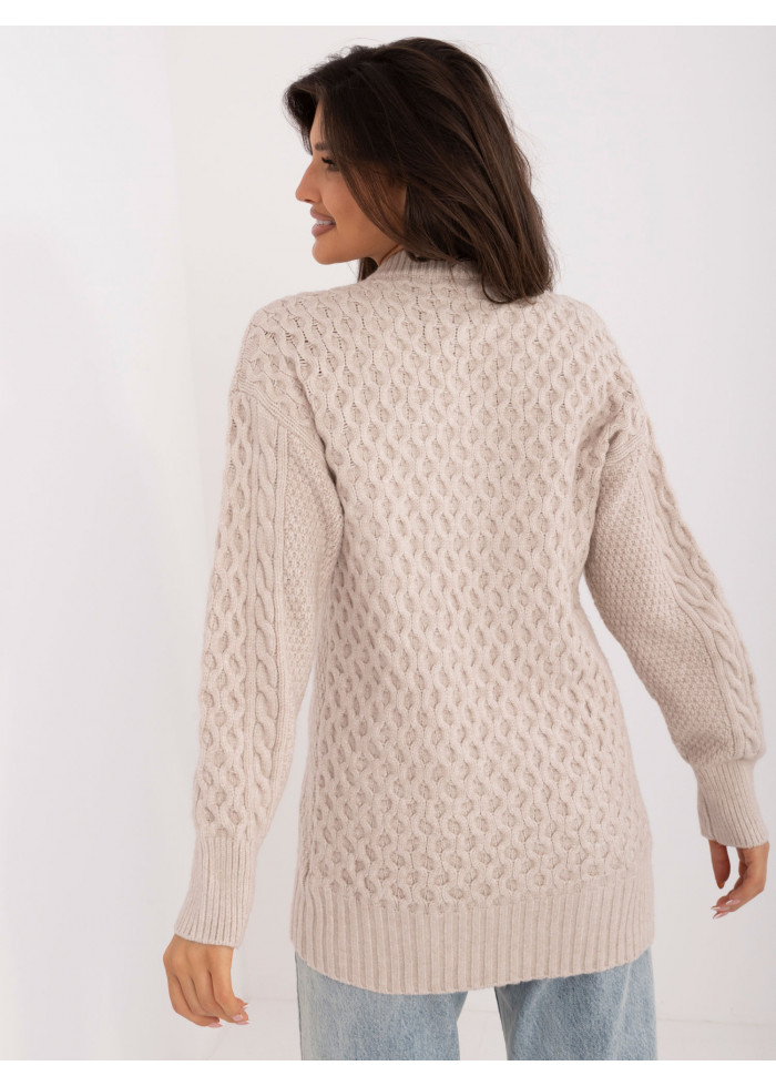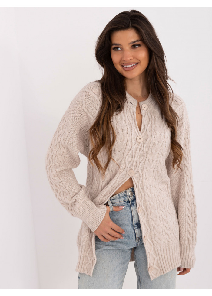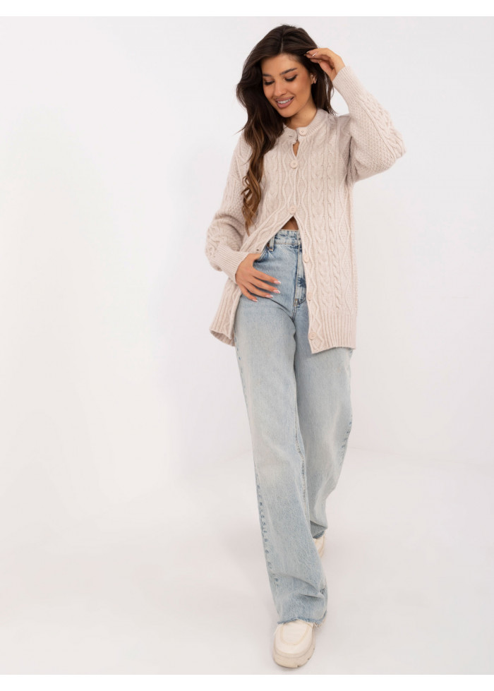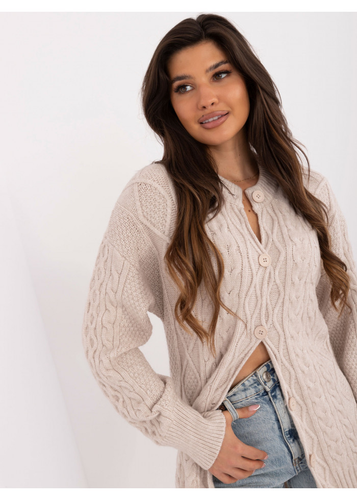 Dámsky sveter na gombíky, módny predlžený strih, zaujímavý pletený vzor, okrúhly dekolt, lémy na koncoch rukávov a v spodnej časti, modelka má na sebe univerzálnu veľkosť, miery modelky: výška: 172 cm, prsia: 88 cm, pás: 63 cm, boky: 92 cm, rozmer produktu meraného na plocho:, šírka pod pazuchami - 58 cm, dĺžka rukáva - 60 cm, celková dĺžka - 75 cm.