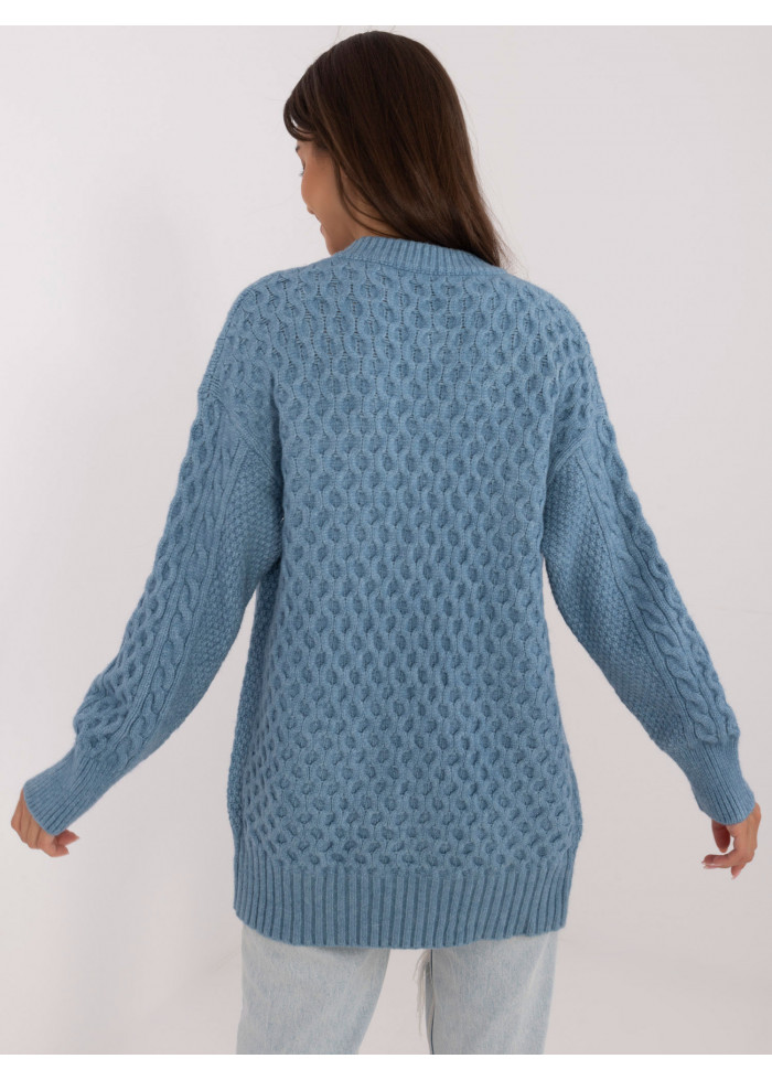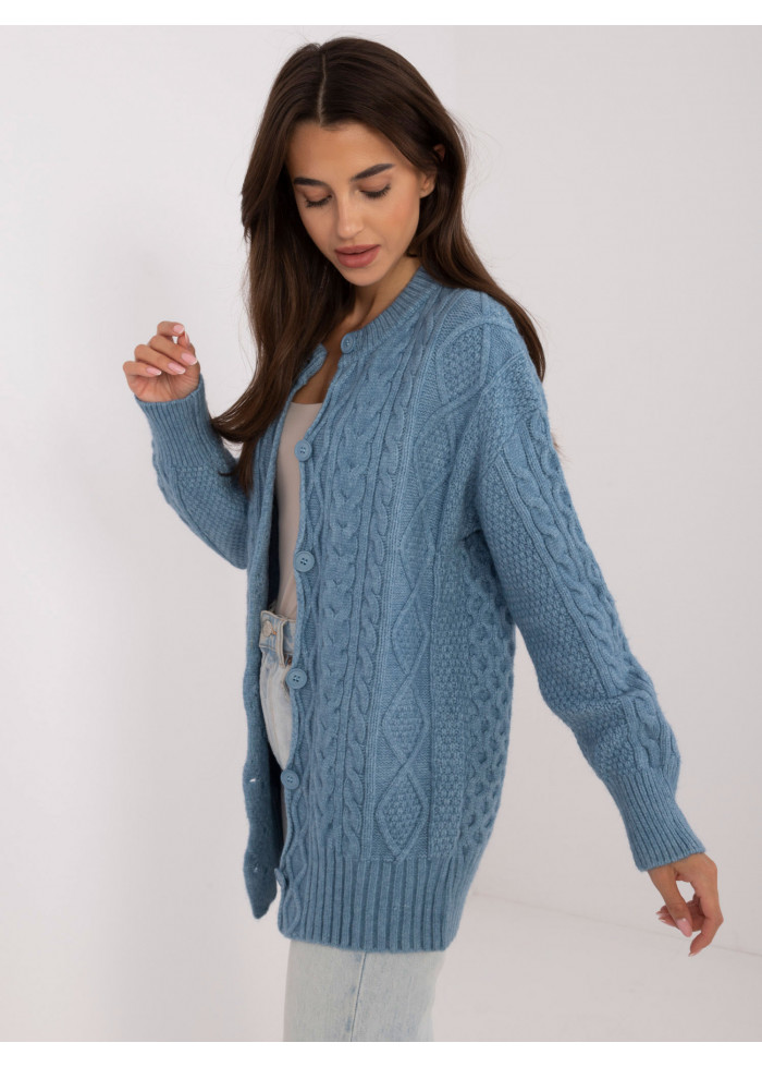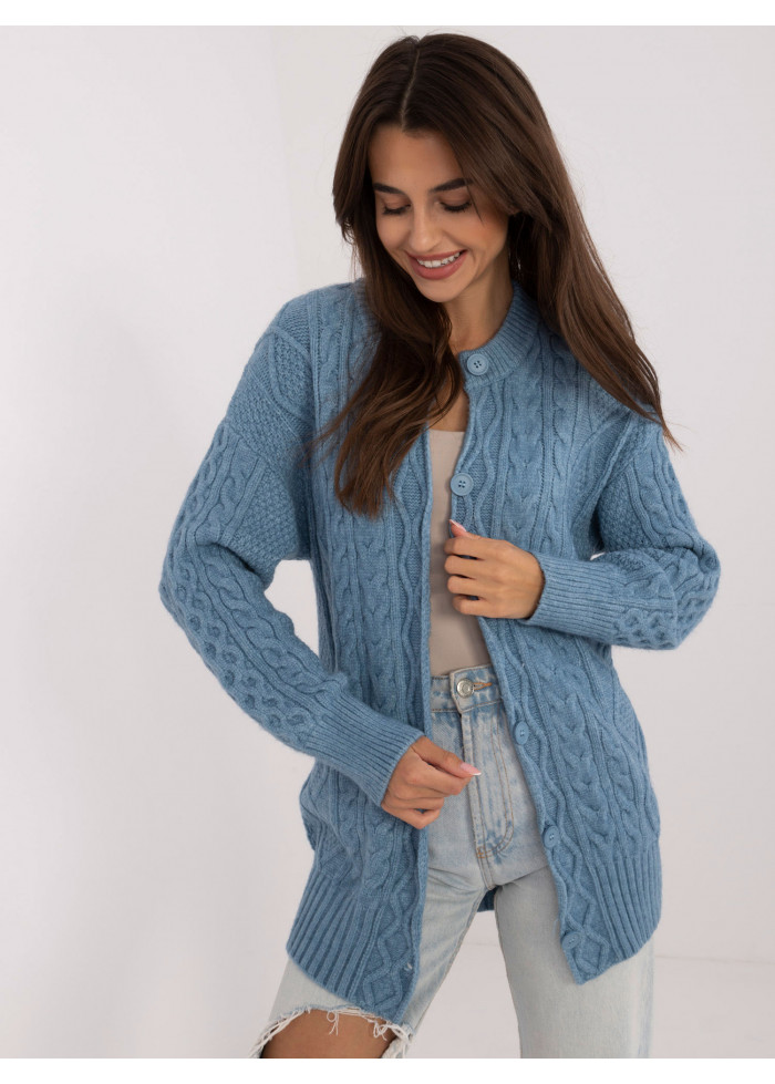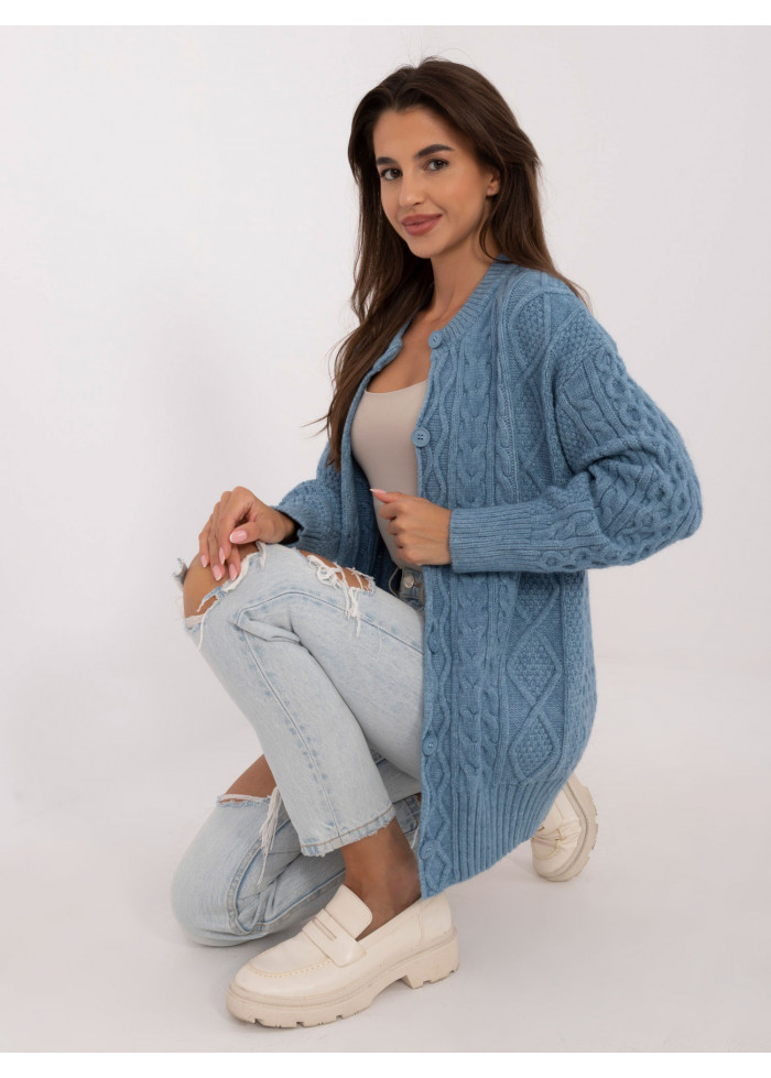 Dámsky sveter na gombíky, módny predlžený strih, zaujímavý pletený vzor, okrúhly dekolt, lémy na koncoch rukávov a v spodnej časti, modelka má na sebe univerzálnu veľkosť, miery modelky: výška: 172 cm, prsia: 88 cm, pás: 63 cm, boky: 92 cm, rozmer produktu meraného na plocho:, šírka pod pazuchami - 58 cm, dĺžka rukáva - 60 cm, celková dĺžka - 75 cm.