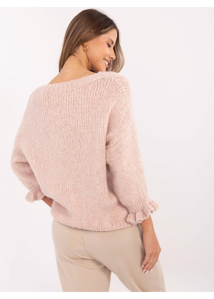 Dámsky pletený sveter, pohodlný voľný strih, okrúhly dekolt, 3/4 rukávy s volánmi, modelka má na sebe univerzálnu veľkosť, miery modelky: výška 176 cm, prsia 90 cm, pás 62 cm, boky 94 cm, rozmer produktu meraného na plocho:, šírka v podpazuší - 60 cm, celková dĺžka - 63 cm, dĺžka rukáva - 36 cm (od švu), šírka bokov - 45 cm (na plocho), šírka bokov - 78 cm (po natiahnutí).