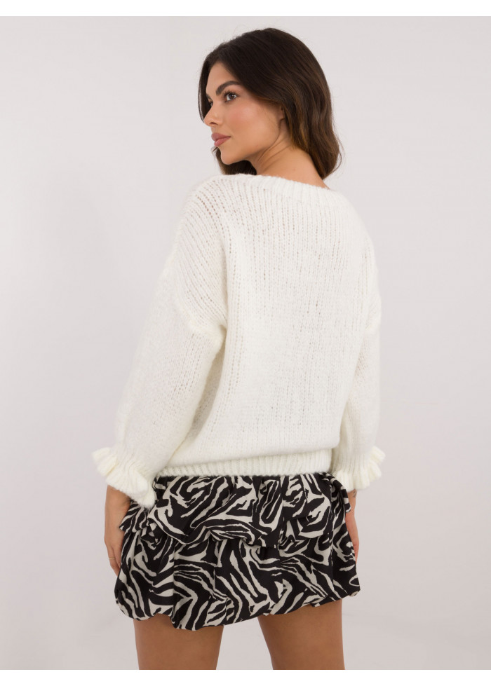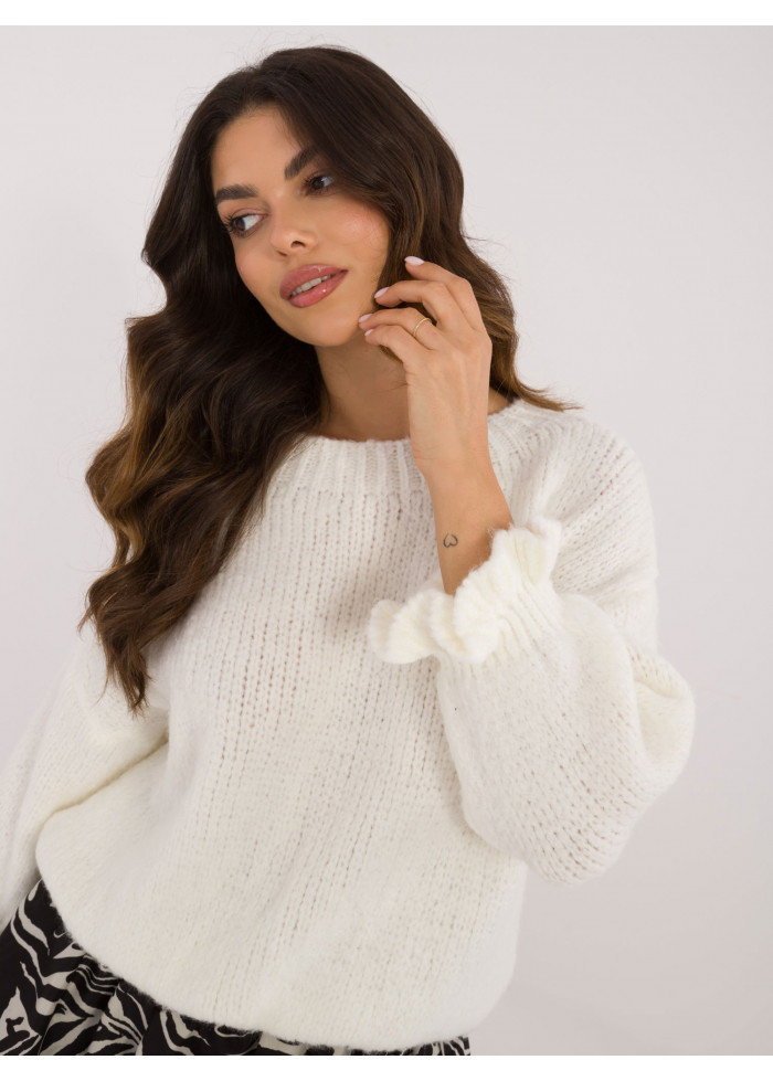 Dámsky pletený sveter, pohodlný voľný strih, okrúhly dekolt, 3/4 rukávy s volánmi, modelka má na sebe univerzálnu veľkosť, miery modelky: výška 176 cm, prsia 90 cm, pás 62 cm, boky 94 cm, rozmer produktu meraného na plocho:, šírka v podpazuší - 60 cm, celková dĺžka - 63 cm, dĺžka rukáva - 36 cm (od švu), šírka bokov - 45 cm (na plocho), šírka bokov - 78 cm (po natiahnutí).