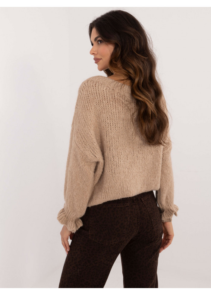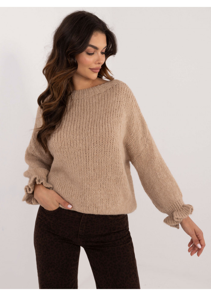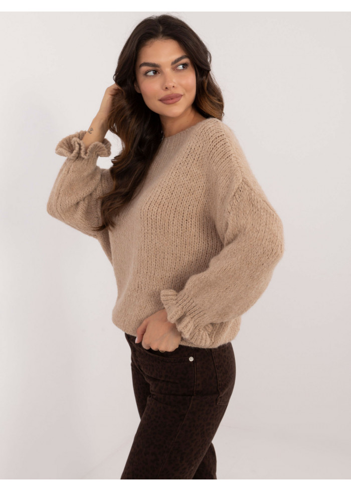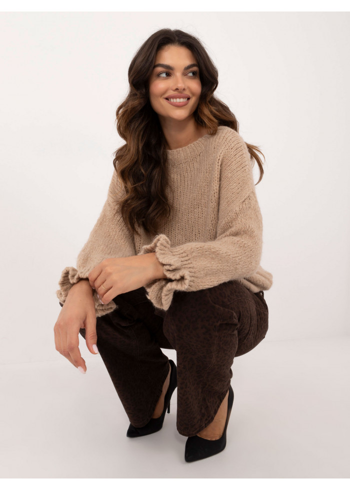 Dámsky pletený sveter, pohodlný voľný strih, okrúhly dekolt, 3/4 rukávy s volánmi, modelka má na sebe univerzálnu veľkosť, miery modelky: výška 176 cm, prsia 90 cm, pás 62 cm, boky 94 cm, rozmer produktu meraného na plocho:, šírka v podpazuší - 60 cm, celková dĺžka - 63 cm, dĺžka rukáva - 36 cm (od švu), šírka bokov - 45 cm (na plocho), šírka bokov - 78 cm (po natiahnutí).