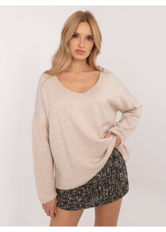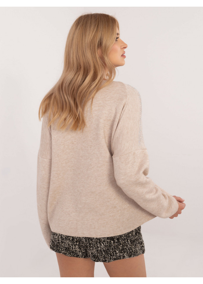 Dámsky sveter s hlbokým dekoltom, ozdobné aplikácie na ramenách, jednoduchý voľný strih, voľné rukávy, modelka má na sebe univerzálnu veľkosť, miery modelky: výška 175 cm, prsia 90 cm, pás 66 cm, boky 94 cm, rozmery produktu v univerzálnej veľkosti:, írka v podpazuší - 68 cm, dĺžka rukáva - 59 cm, celková dĺžka - 61 cm..
