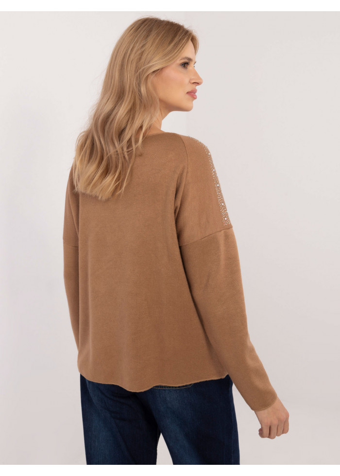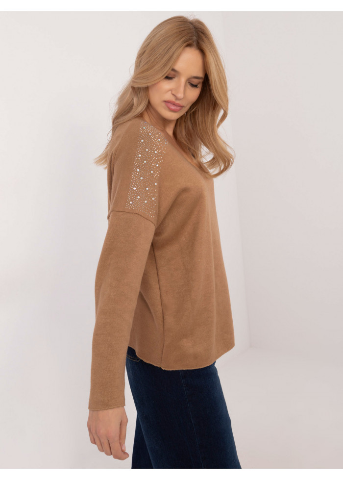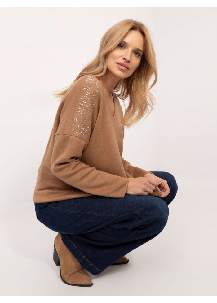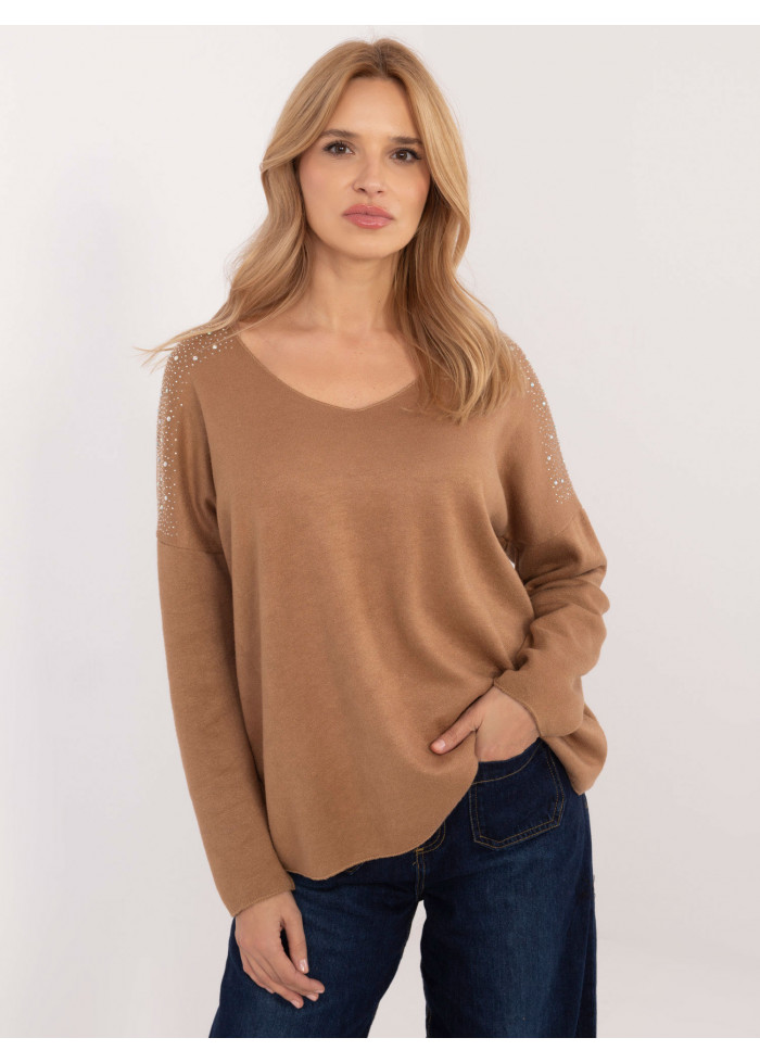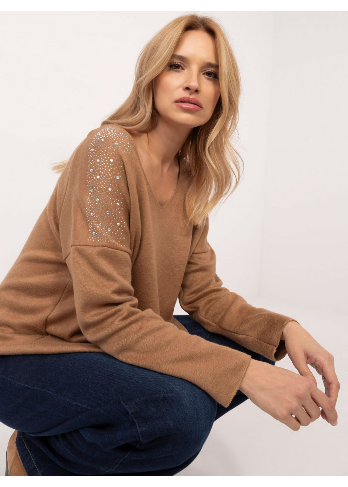 Dámsky sveter s hlbokým dekoltom, ozdobné aplikácie na ramenách, jednoduchý voľný strih, voľné rukávy, modelka má na sebe univerzálnu veľkosť, miery modelky: výška 175 cm, prsia 90 cm, pás 66 cm, boky 94 cm, rozmery produktu v univerzálnej veľkosti:, írka v podpazuší - 68 cm, dĺžka rukáva - 59 cm, celková dĺžka - 61 cm..