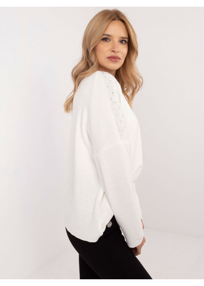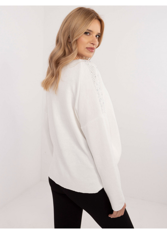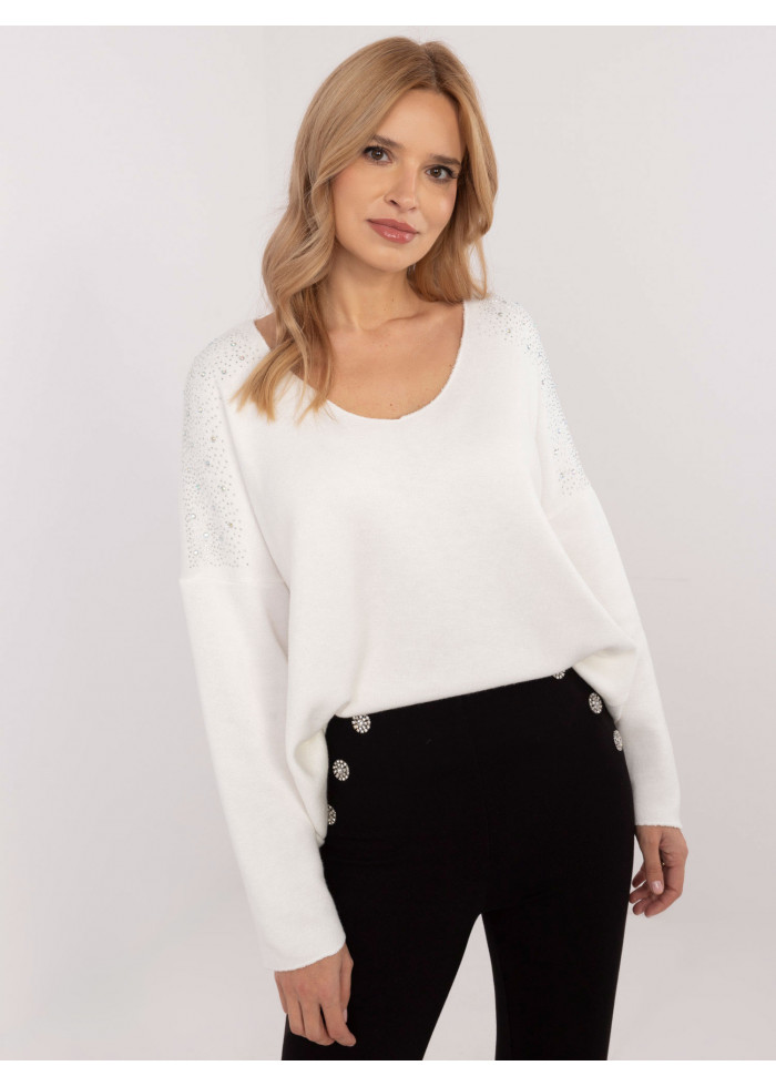 Dámsky sveter s hlbokým dekoltom, ozdobné aplikácie na ramenách, jednoduchý voľný strih, voľné rukávy, modelka má na sebe univerzálnu veľkosť, miery modelky: výška 175 cm, prsia 90 cm, pás 66 cm, boky 94 cm, rozmery produktu v univerzálnej veľkosti:, írka v podpazuší - 68 cm, dĺžka rukáva - 59 cm, celková dĺžka - 61 cm..