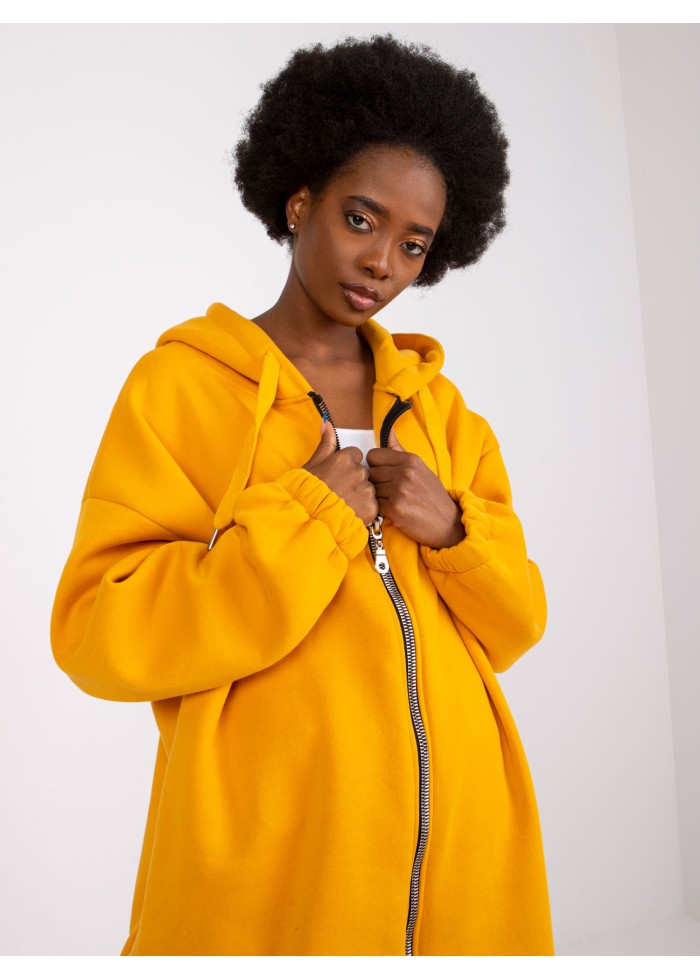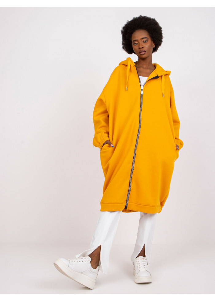 Dámska mikina s kapucňou, zapínanie na zips, štýlový oversize strih, midi dĺžka, 2 vrecká, sťahovacia guma na koncoch rukávov, sťahujúca guma v spodnej časti, spôsob prania: pranie v práčke na 30°c, materiál: 90% bavlna, 10% elastan, modelka má na sebe veľkosť s/m, modelka má na sebe veľkosť s/m. rozmery modelky: výška 167 cm, prsia 82 cm, pás 59 cm, boky 83 cm., rozmer produktu meraného na plocho, vo veľkosti s/m:, šírka pod plecami: 65 cm, celková dĺžka: 100 cm, dĺžka rukávov: 60 cm.