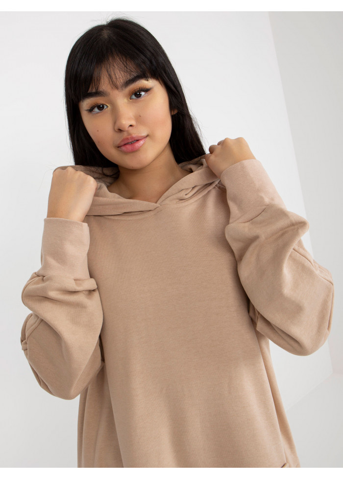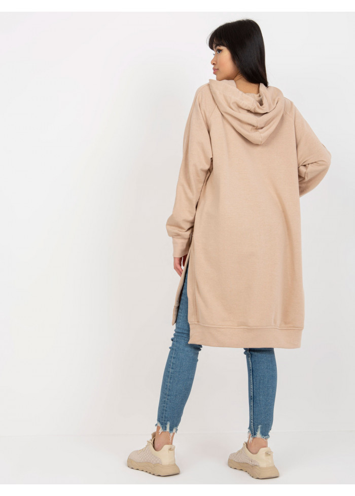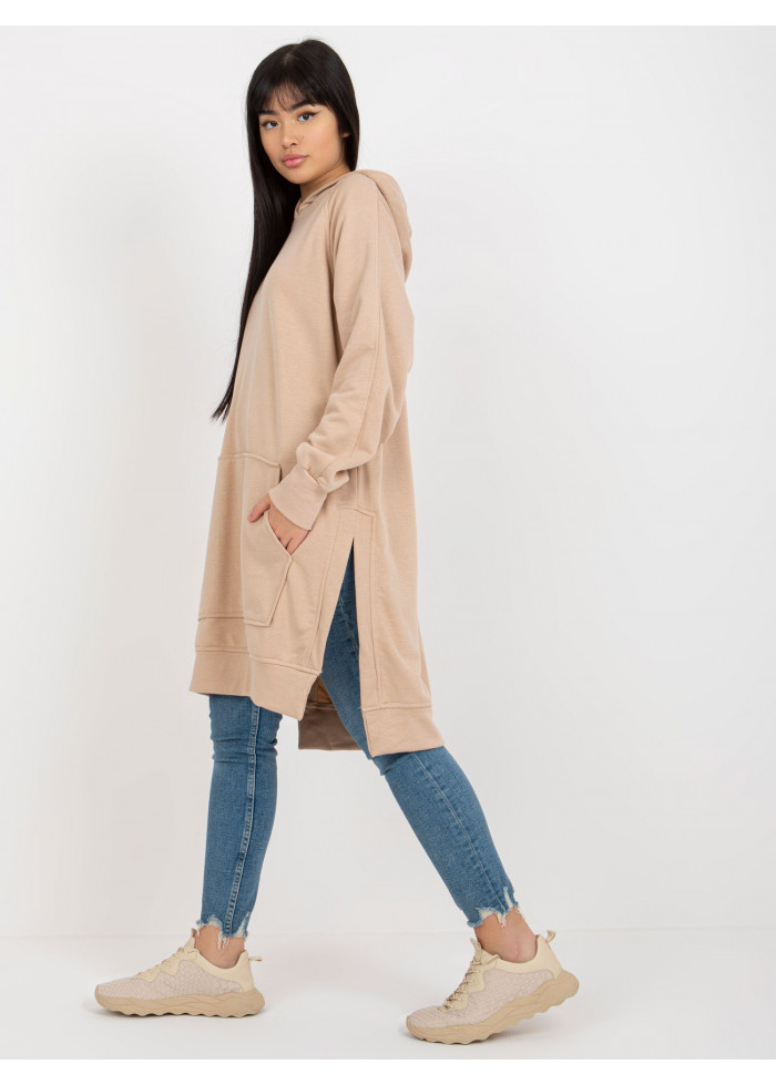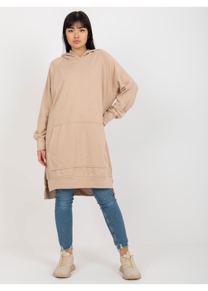 Dámska predĺžená mikina, mikinová tunika s kapucňou, klokanie vrecko, rozparky po bokoch, lémy na koncoch rukávov a v spodnej časti, univerzálna veľkosť, miery modelky: výška: 167 cm, prsia: 73 cm, pás: 64 cm, boky: 91 cm, rozmer produktu meraného na plocho:, šírka pod plecami: 64 cm, dĺžka rukáva: 62 cm, celková dĺžka: 98 cm.
