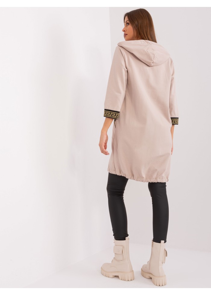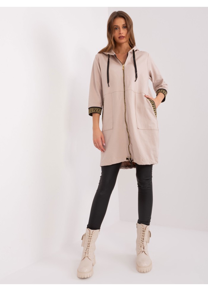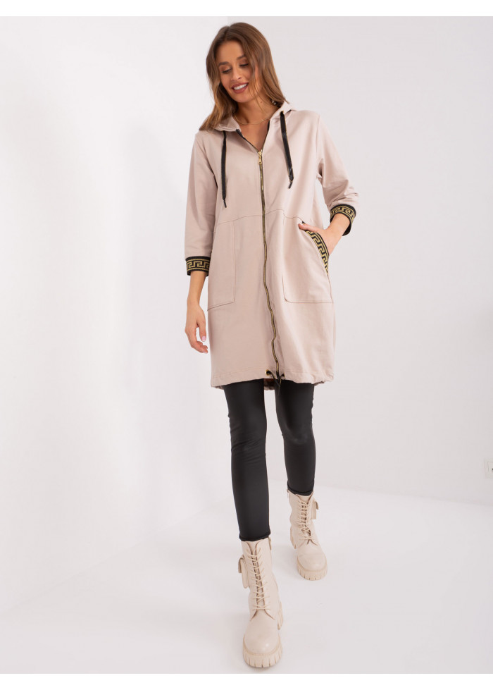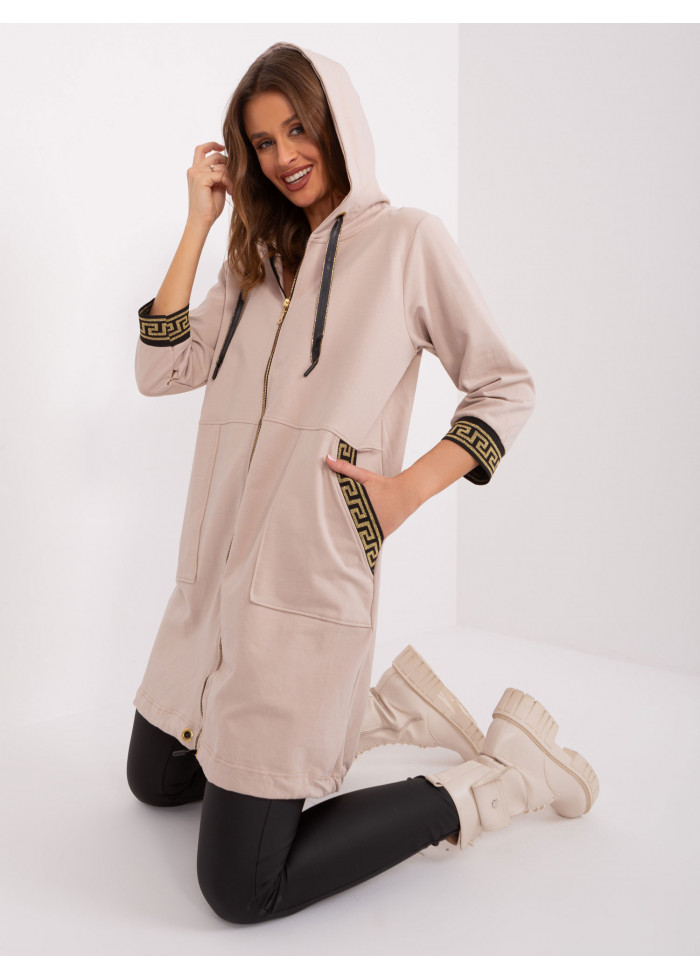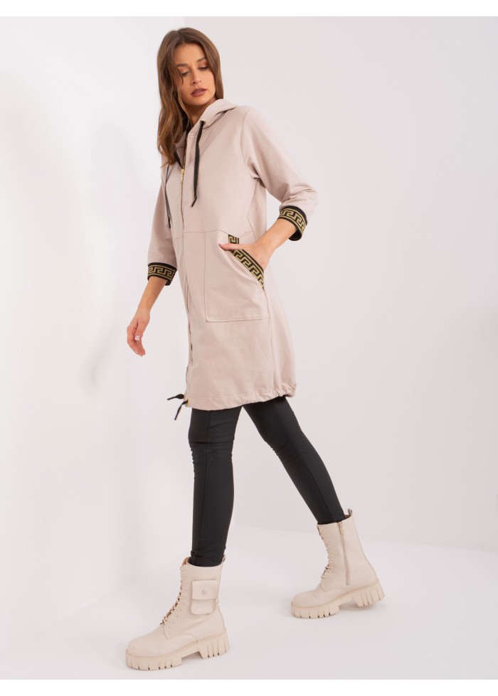 Dlhá mikina s kapucňou, ozdobná šnúrka na kapucni, zapínanie na zips, 2 vrecká, šnúrka v spodnej časti, ozdobné lemovanie, modelka má na sebe veľkosť s/m, miery modelky: výška 176 cm, prsia 85 cm, pás 64 cm, boky 92 cm, rozmer produktu meraného na plocho, vo veľkosti s/m:, šírka pod plecami: 52 cm, dĺžka rukáva: 48 cm, celková dĺžka: 93 cm.