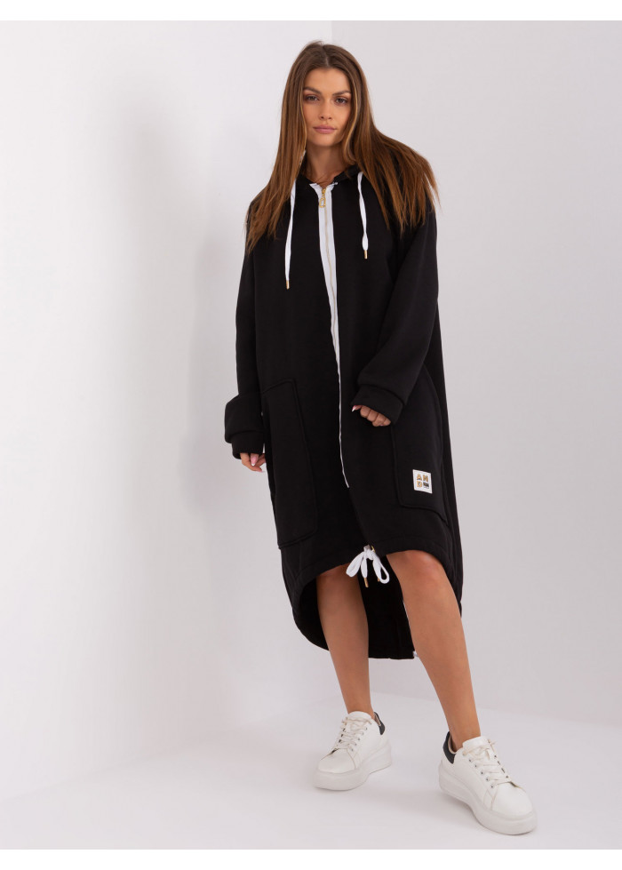 Dlhá dámska mikina s kapucňou, kapucňa so šnúrkou, zapínanie na zips, 2 vrecká, asymetrický strih, ozdobné šnúrky v spodnej časti, lémy na koncoch rukávov, modelka má na sebe veľkosť s/m. rozmery modelky: výška 176 cm, prsia 85 cm, pás 64 cm, boky 92 cm., rozmer produktu meraného na plocho, vo veľkosti s/m:, šírka pod plecami: 68 cm, dĺžka rukáva: 60 cm, celková dĺžka: vpredu: 93 cm, vzadu: 116 cm.