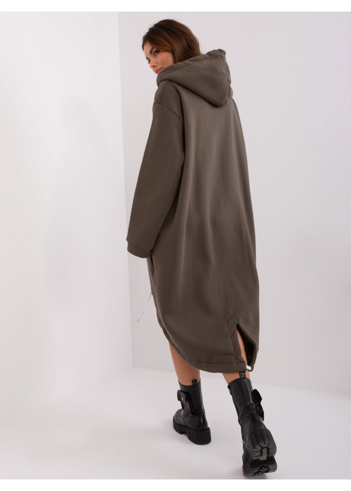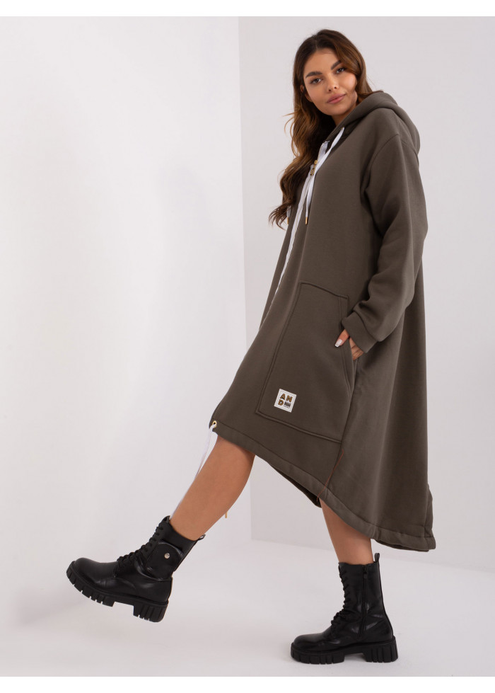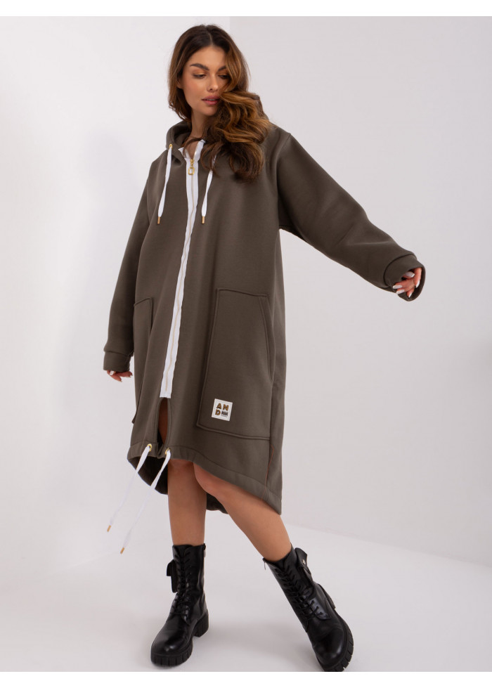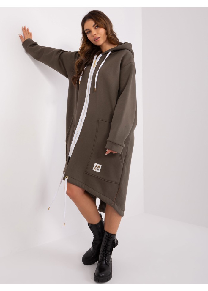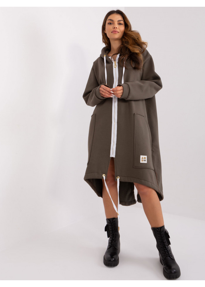 Dlhá dámska mikina s kapucňou, kapucňa so šnúrkou, zapínanie na zips, 2 vrecká, asymetrický strih, ozdobné šnúrky v spodnej časti, lémy na koncoch rukávov, modelka má na sebe veľkosť s/m. rozmery modelky: výška 176 cm, prsia 85 cm, pás 64 cm, boky 92 cm., rozmer produktu meraného na plocho, vo veľkosti s/m:, šírka pod plecami: 68 cm, dĺžka rukáva: 60 cm, celková dĺžka: vpredu: 93 cm, vzadu: 116 cm.