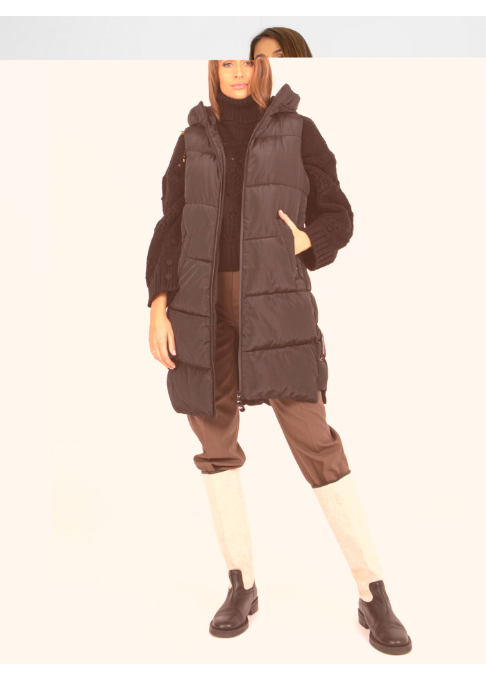 Dlhá prešívaná vesta s kapucňou, zapínanie na zips, 2 vrecká, ozdobné aplikácie, vysoký golier, spôsob prania: pranie v práčke na 30°c, materiál: 100% polyester, modelka má na sebe veľkosť s, miery modelky: výška: 177 cm, prsia: 92 cm, pás: 63 cm, boky: 93 cm, rozmer produktu meraného na plocho, vo veľkosti s:, šírka pod plecami: 51 cm, celková dĺžka: 92 cm.