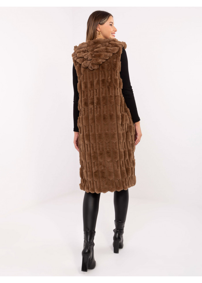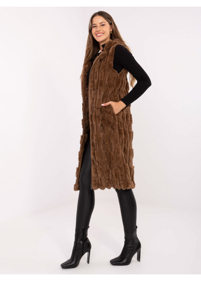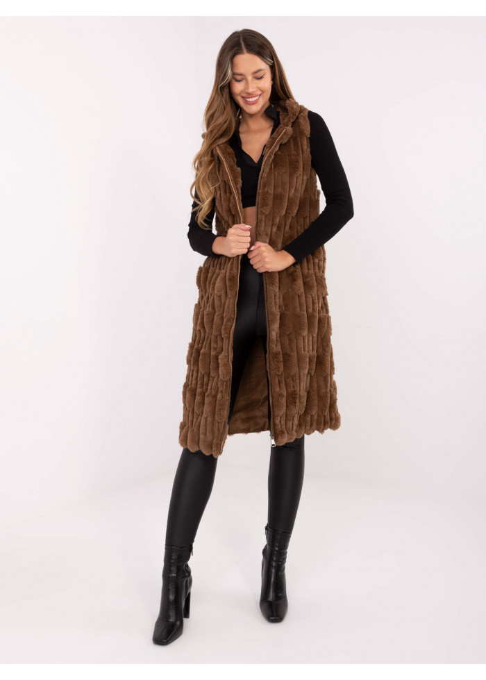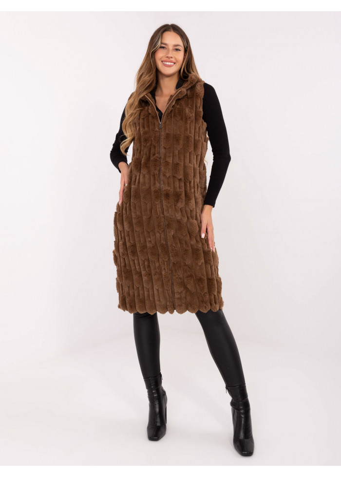 Dlhá dámska vesta s kapucňou, zapínanie na zips, modelka má na sebe veľkosť s/m, miery modelky: výška: 175 cm, prsia: 90 cm, pás: 66 cm, boky: 94 cm, rozmer produktu meraného na plocho, vo veľkosti s/m:, šírka pod plecami: 50 cm, celková dĺžka: 106 cm.