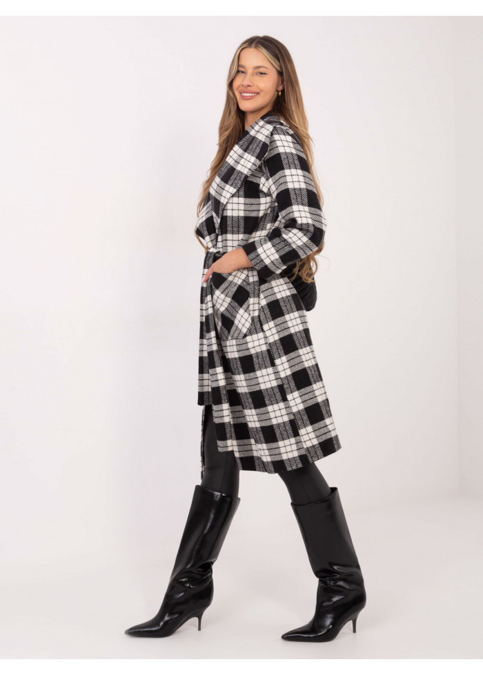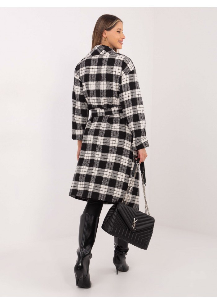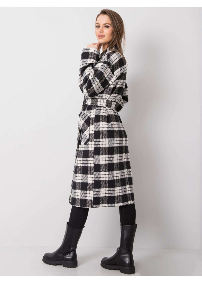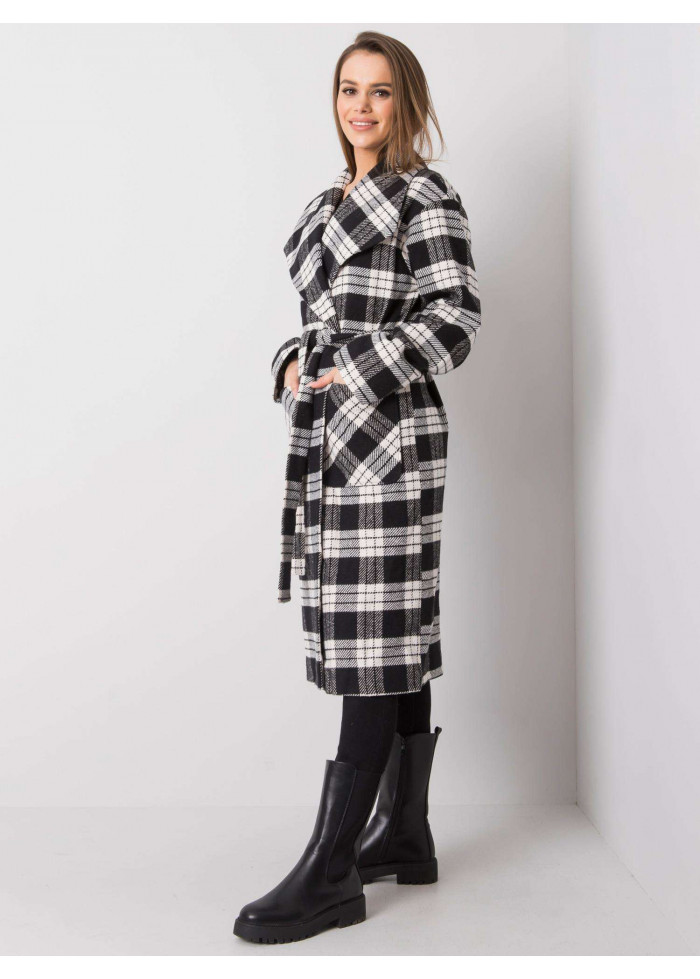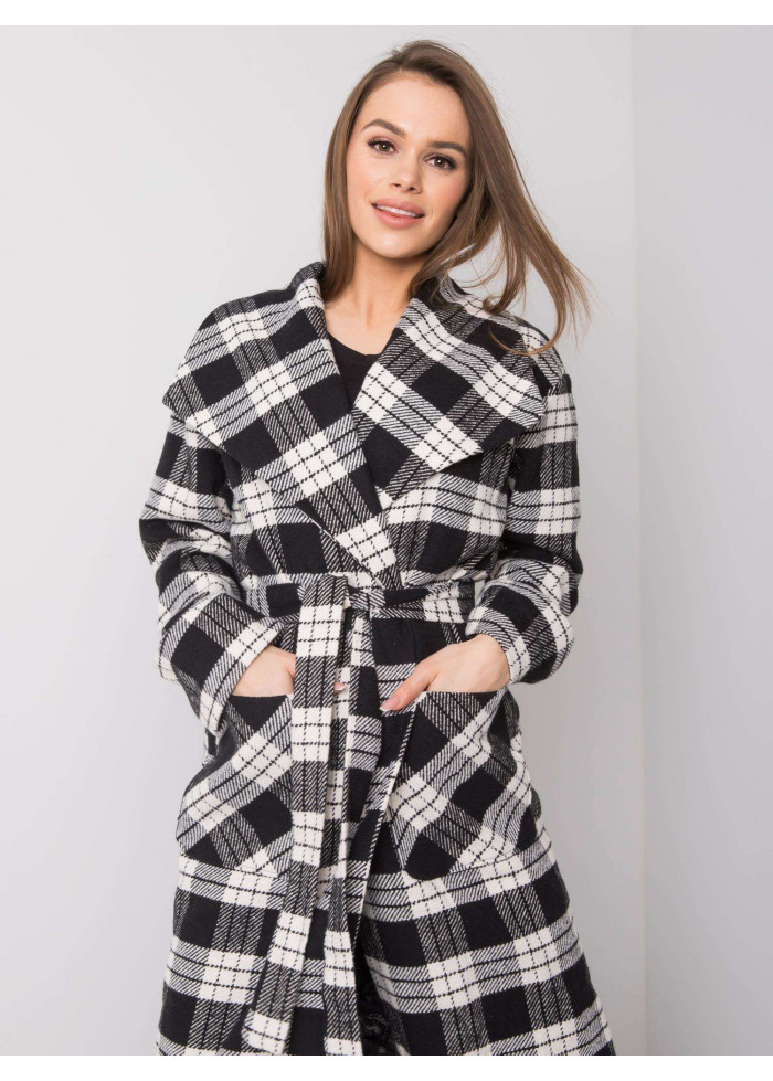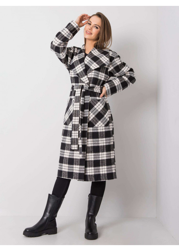 Károvaný kabát, kabát s veľkým golierom, opasok je súčasťou, 2 veľké vrecká v prednej časti, pranie chemicky, materiál: 100% vlna, modelka má na sebe veľkosť 36, rozmer produktu meraného na plocho, vo veľkosti 36:, miery modelky: výška: 174 cm, prsia: 87 cm, pás: 61 cm, boky: 89 cm, šírka pod plecami: 50 cm, celková dĺžka: 109 cm, dĺžka rukávov: 62 cm.