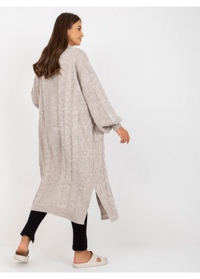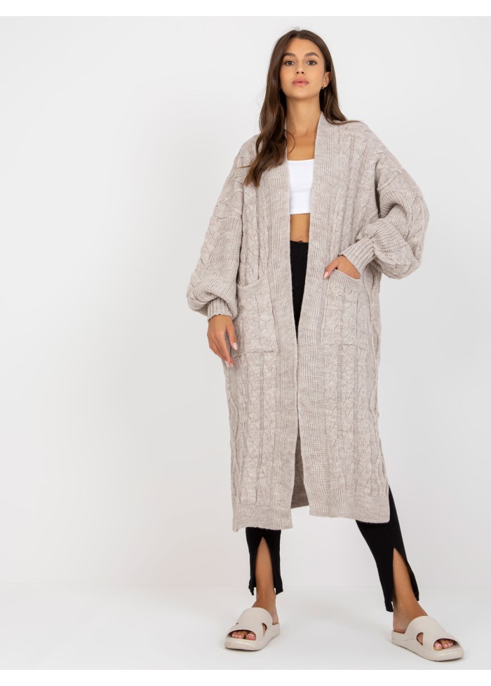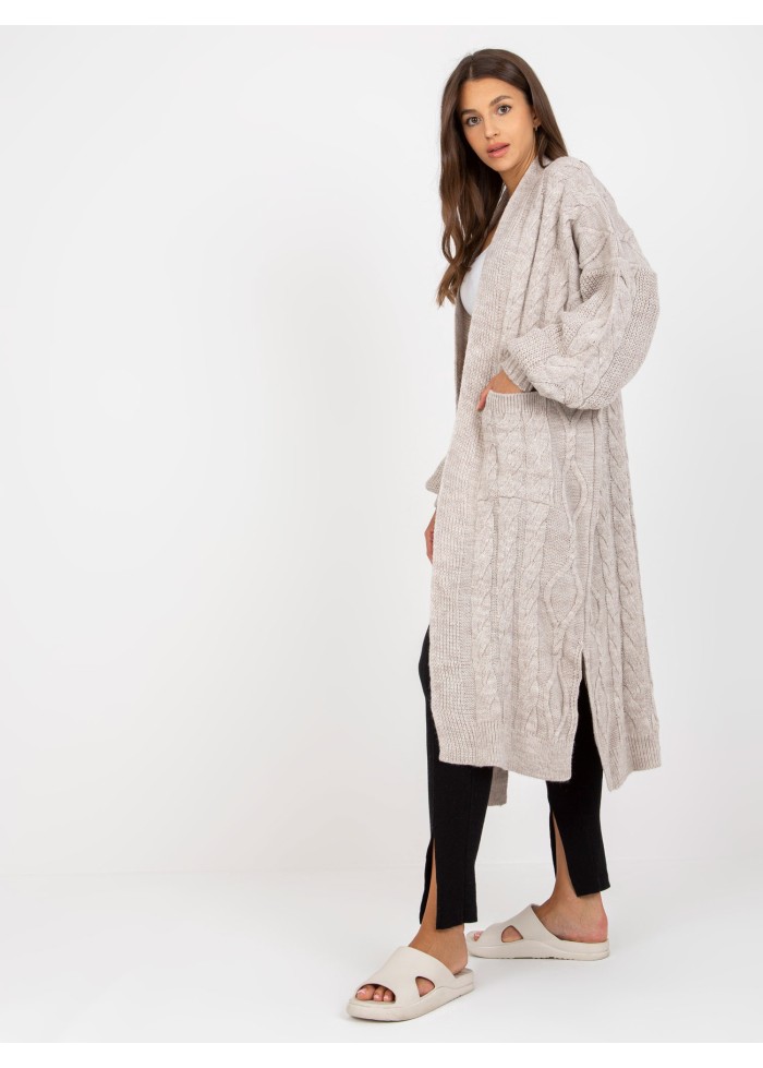 Dámsky dlhý pletený kardigán, 2 vrecká, rozparky na bokoch, univerzálna veľkosť, miery modelky: výška: 178 cm, prsia: 89 cm, pás: 65 cm, boky: 95 cm, rozmer produktu meraného na plocho:, šírka pod plecami: 69 cm, dĺžka rukáva: 61 cm, celková dĺžka: 110 cm.