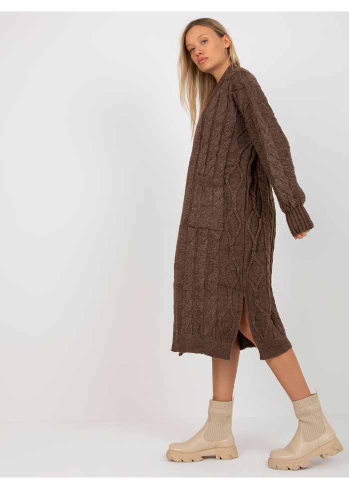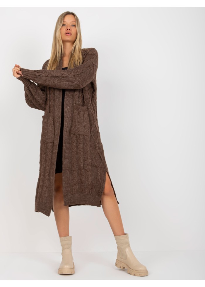 Dámsky dlhý pletený kardigán, 2 vrecká, rozparky na bokoch, univerzálna veľkosť, miery modelky: výška: 178 cm, prsia: 89 cm, pás: 65 cm, boky: 95 cm, rozmer produktu meraného na plocho:, šírka pod plecami: 69 cm, dĺžka rukáva: 61 cm, celková dĺžka: 110 cm.