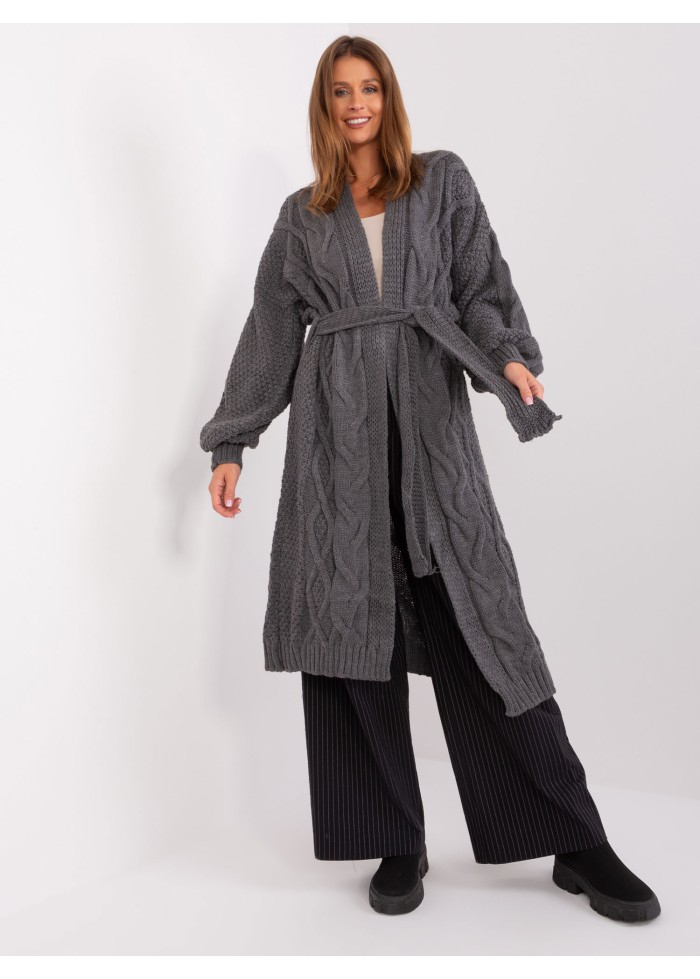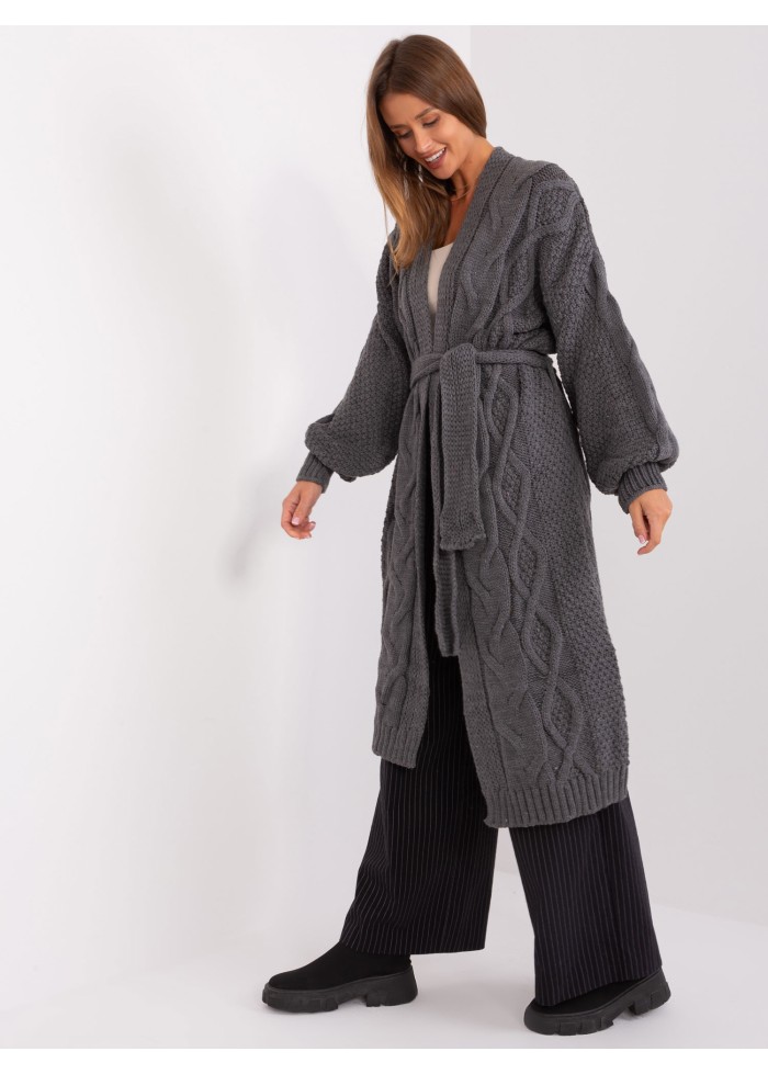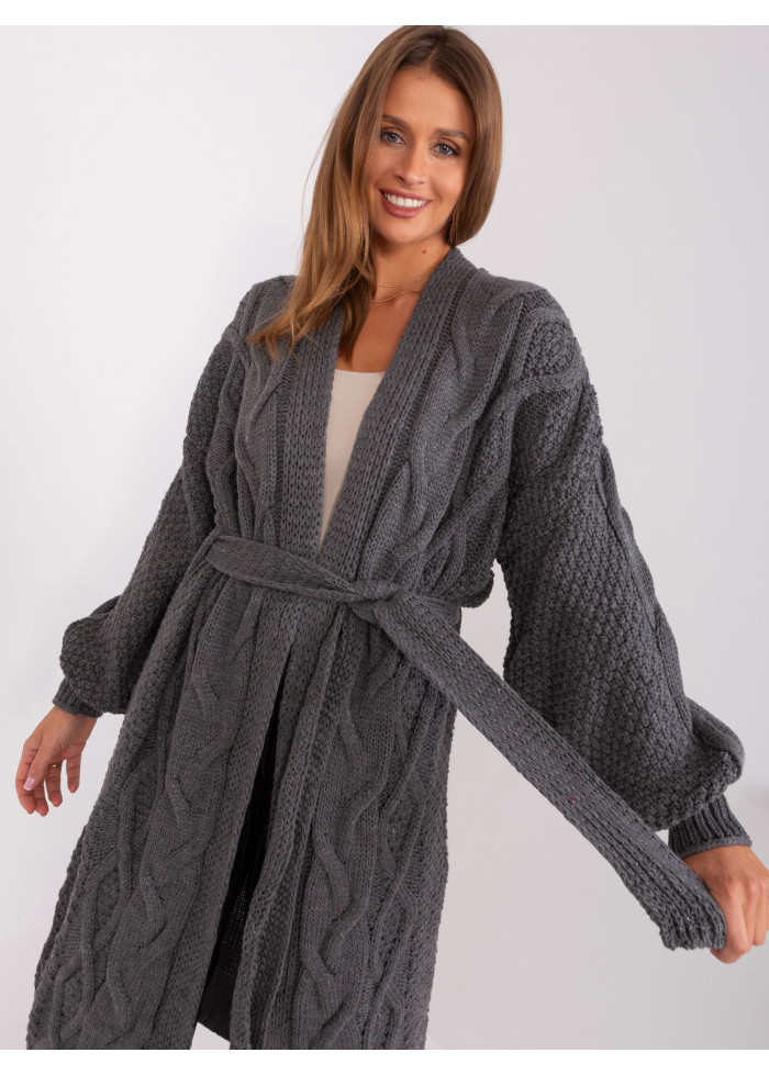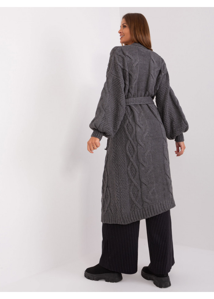 Dlhý kardigán s opaskom, pletený vzor, balónové rukávy, lémy na konci rukávov, univerzálna veľkosť, miery modelky: výška 176 cm, prsia 85 cm, pás 64 cm, boky 92 cm, rozmer produktu meraného na plocho:, šírka pod plecami: 67 cm, dĺžka rukáva: 60 cm, celková dĺžka: 109 cm.