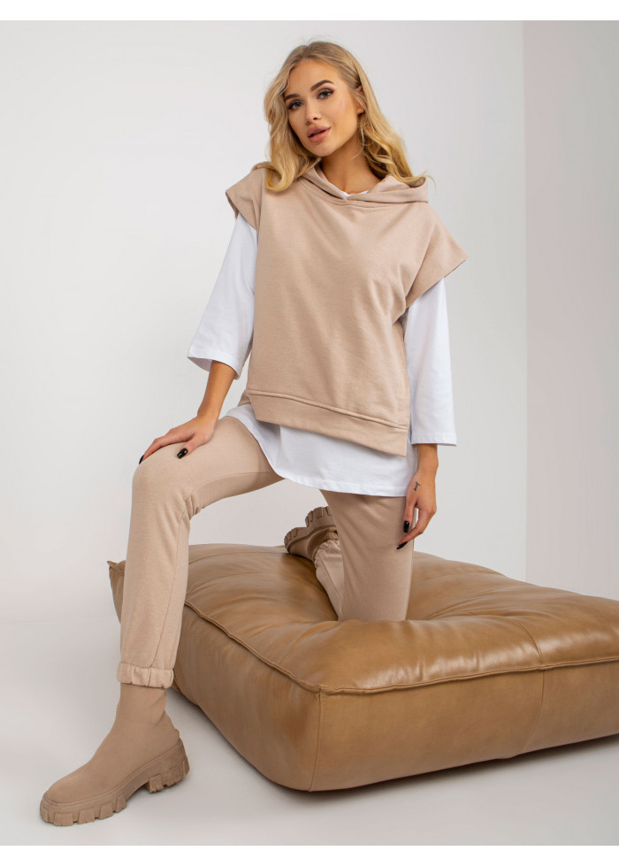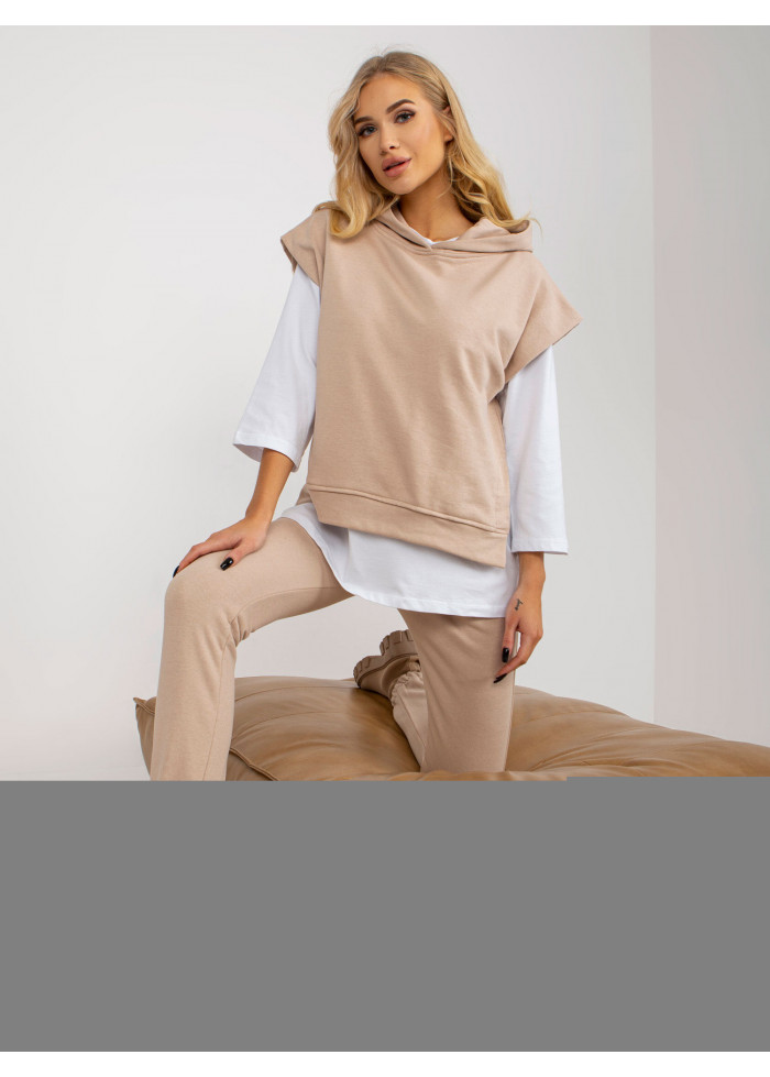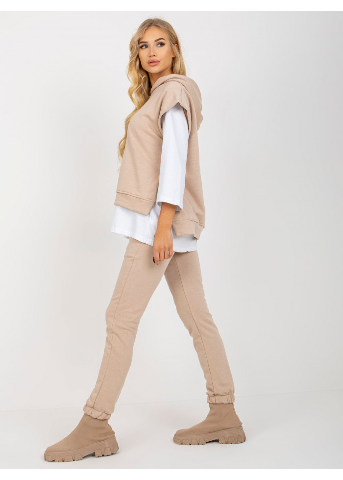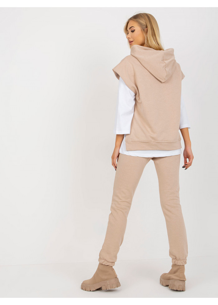 Dámsky komplet, tepláková vesta s kapucňou, lém na spodnej časti, rozparky po bokoch, bavlnené tričko s 3/4 rukávom, okrúhly výstrih, dlhší strih, dlhé nohavice na gumu v páse, ozdobná šnúrka v páse, 2 vrecká, guma na spodku nohavíc, univerzálna veľkosť, miery modelky: výška: 177 cm, prsia: 84 cm, pás: 62 cm, boky: 89 cm, rozmer produktu meraného na plocho:, šírka pod plecami: 55 cm, dĺžka vesty: 65 cm, šírka trička pod plecami: 55 cm, dĺžka rukáva: 52 cm, celková dĺžka: 75 cm, šírka nohavíc v páse: 34 cm, výška sedu: 30 cm, dĺžka nohavíc: 95 cm.