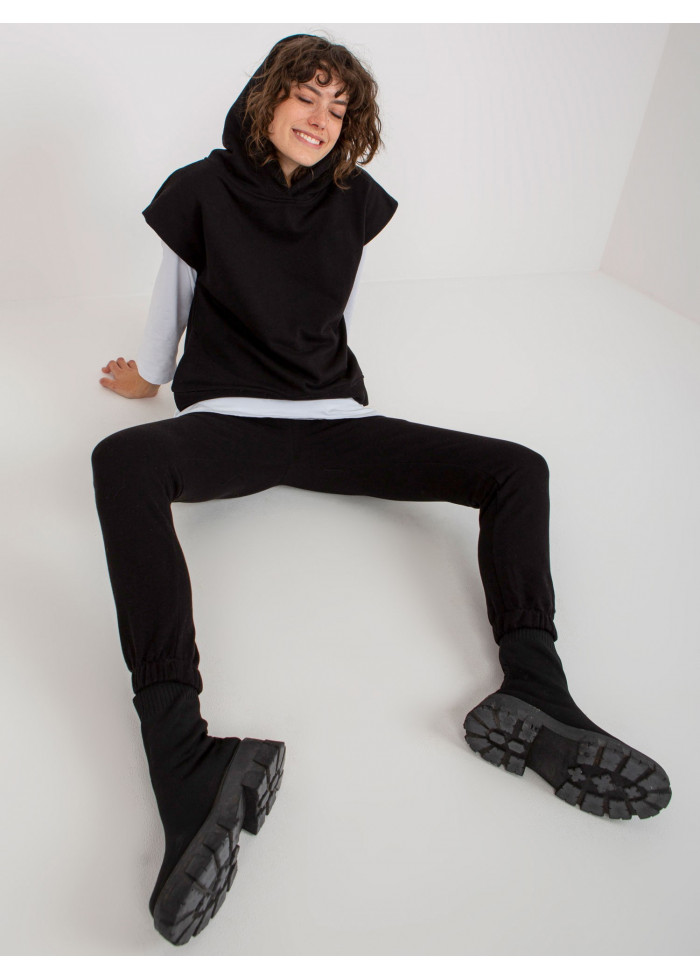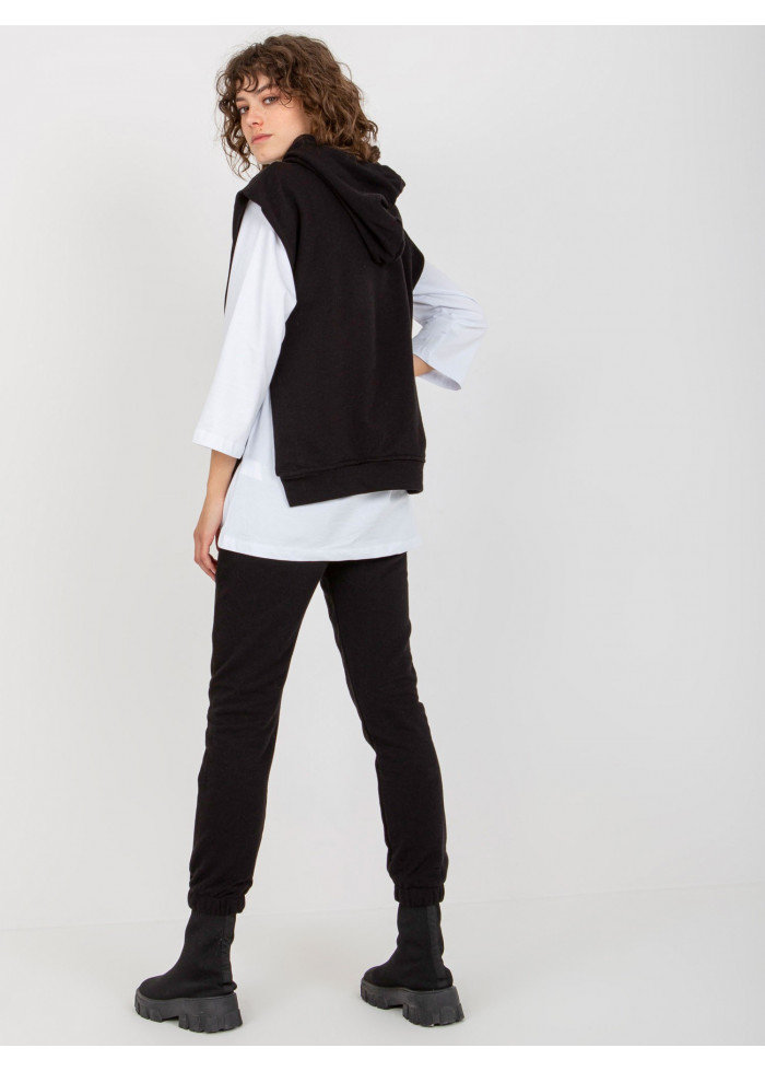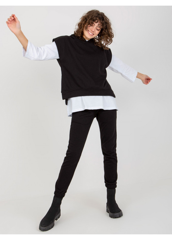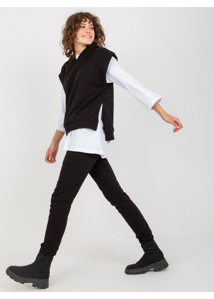 Dámsky komplet, tepláková vesta s kapucňou, lém na spodnej časti, rozparky po bokoch, bavlnené tričko s 3/4 rukávom, okrúhly výstrih, dlhší strih, dlhé nohavice na gumu v páse, ozdobná šnúrka v páse, 2 vrecká, guma na spodku nohavíc, univerzálna veľkosť, miery modelky: výška: 177 cm, prsia: 84 cm, pás: 62 cm, boky: 89 cm, rozmer produktu meraného na plocho:, šírka pod plecami: 55 cm, dĺžka vesty: 65 cm, šírka trička pod plecami: 55 cm, dĺžka rukáva: 52 cm, celková dĺžka: 75 cm, šírka nohavíc v páse: 34 cm, výška sedu: 30 cm, dĺžka nohavíc: 95 cm.