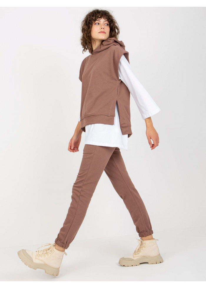 Dámsky komplet, tepláková vesta s kapucňou, lém na spodnej časti, rozparky po bokoch, bavlnené tričko s 3/4 rukávom, okrúhly výstrih, dlhší strih, dlhé nohavice na gumu v páse, ozdobná šnúrka v páse, 2 vrecká, guma na spodku nohavíc, univerzálna veľkosť, miery modelky: výška: 177 cm, prsia: 84 cm, pás: 62 cm, boky: 89 cm, rozmer produktu meraného na plocho:, šírka pod plecami: 55 cm, dĺžka vesty: 65 cm, šírka trička pod plecami: 55 cm, dĺžka rukáva: 52 cm, celková dĺžka: 75 cm, šírka nohavíc v páse: 34 cm, výška sedu: 30 cm, dĺžka nohavíc: 95 cm.