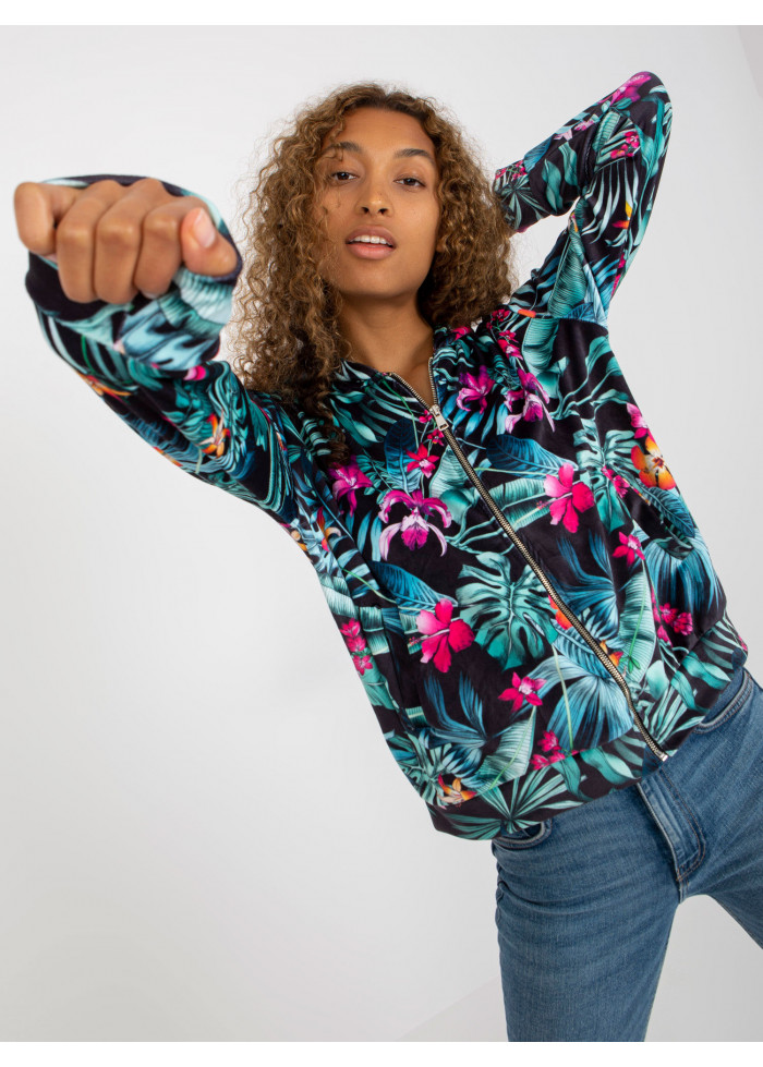 Dámska kvetovaná mikina s kapucňou, zapínanie na zips, jednoduchý strih, 2 vrecká, lémy na koncoch rukávov a v spodnej časti, spôsob prania: pranie v práčke na 30°c, materiál: 90% viskóza, 10% elastan, modelka má na sebe veľkosť s/m, miery modelky: výška: 178 cm, prsia: 82 cm, pás: 61 cm, boky: 88 cm, rozmer produktu meraného na plocho, vo veľkosti s/m:, šírka pod plecami: 55 cm, dĺžka rukáva: 56 cm, celková dĺžka: 58 cm.