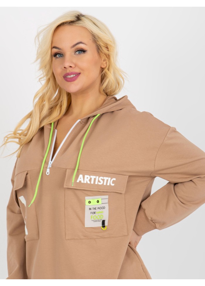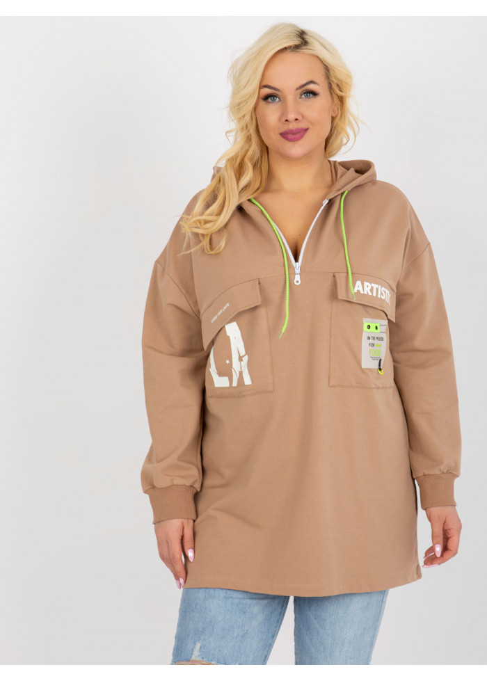 Dámska mikina s kapucňou, kontrastné šnúrky na kapucni, od polovice zapínanie na zips, 2 náprsné vrecká, ozdobné nápisy, ozdobné aplikácie, lémy na koncoch rukávov, univerzálna veľkosť, miery modelky: výška 172 cm, prsia 103 cm, pás 73 cm, boky 103 cm., rozmer produktu meraného na plocho:, šírka pod plecami: 64 cm, dĺžka rukáva: 63 cm, celková dĺžka: 81 cm.