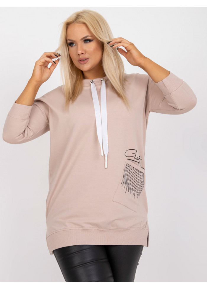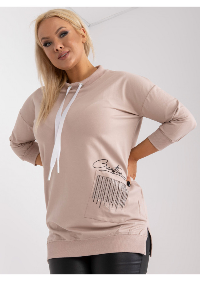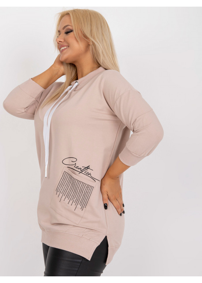Mikina, ozdobná šnúrka v dekolte, 3/4 rukávy, okrúhly výstrih, ozdobné aplikácie, materiál: 90% bavlna, 10% elastan, spôsob prania: pranie v práčke na 30°c, univerzálna veľkosť, miery modelky: výška 172 cm, prsia 103 cm, pás 73 cm, boky 103 cm., rozmer produktu meraného na plocho:, šírka pod plecami: 56 cm, dĺžka rukáva: 44 cm, celková dĺžka: 76 cm.