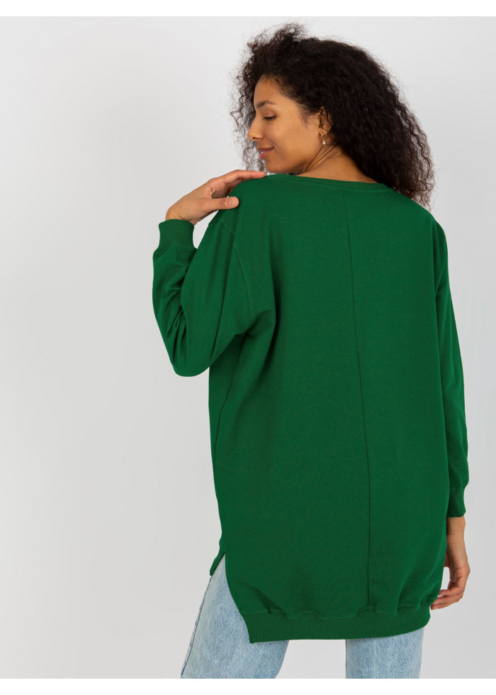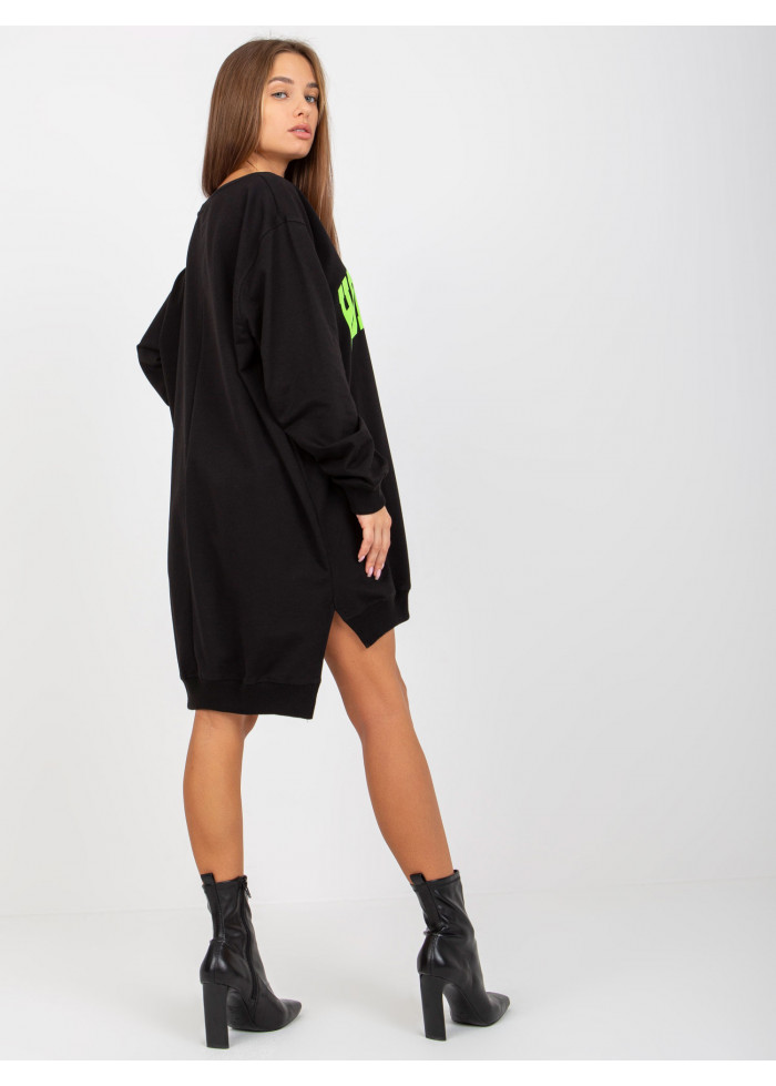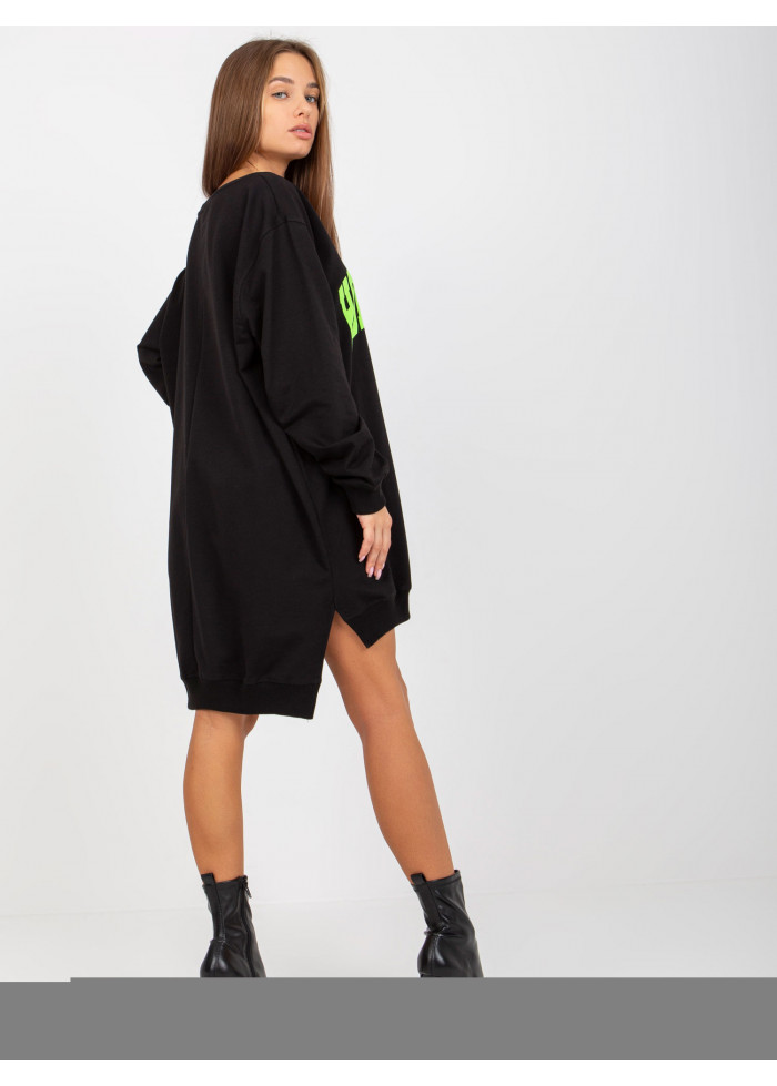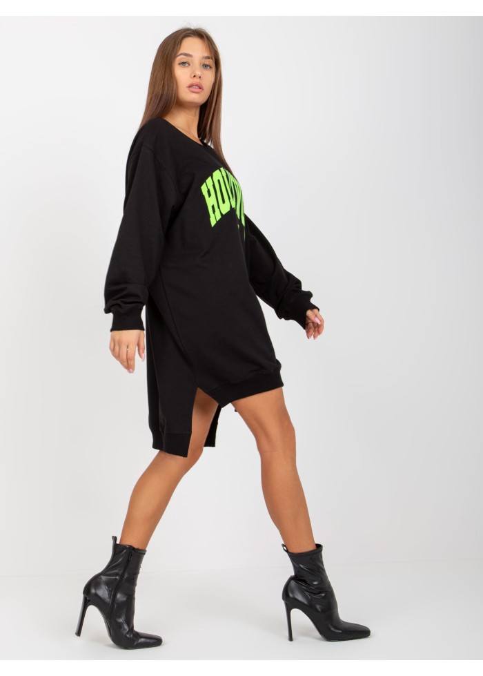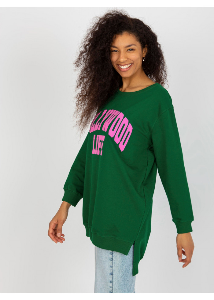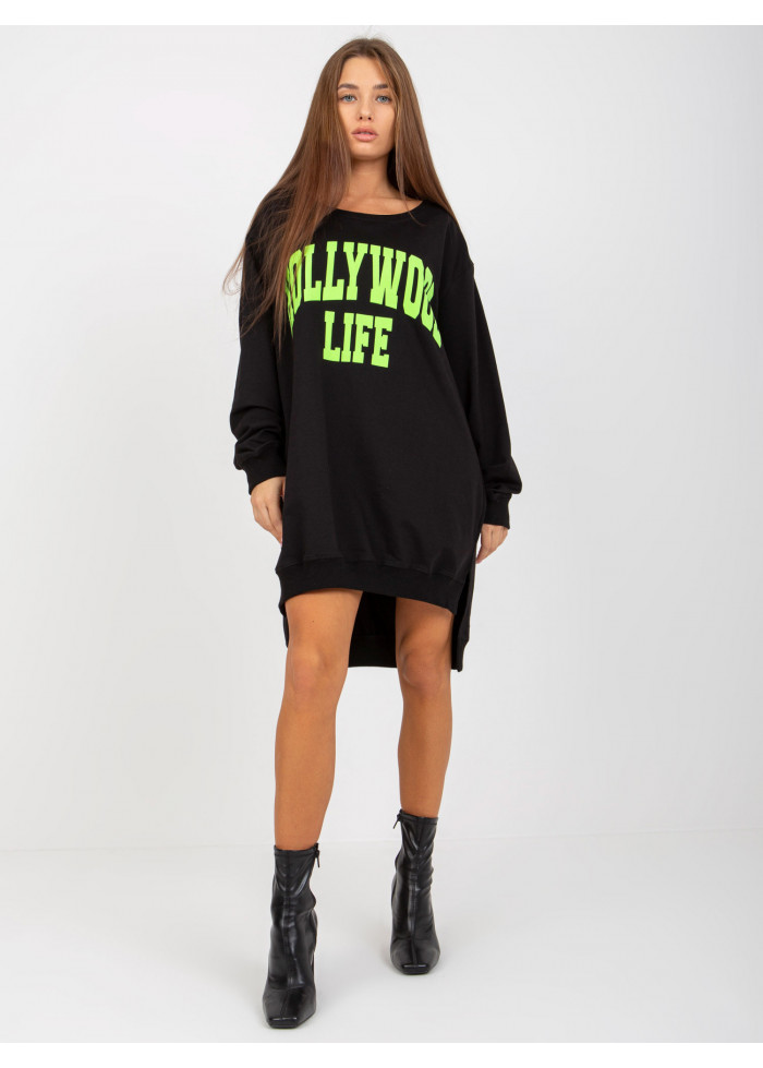 Dámska mikina, asymetrický strih, okrúhly výstrih, lémy na koncoch rukávov a v spodnej časti, rozparky na bokoch, ozdobná potlač, univerzálna veľkosť, miery modelky: výška: 173 cm, prsia: 78 cm, pás: 60 cm, boky: 90 cm, rozmer produktu meraného na plocho:, šírka pod plecami: 65 cm, dĺžka rukáva: 58 cm, celková dĺžka: vpredu: 75 cm, vzadu: 86 cm.