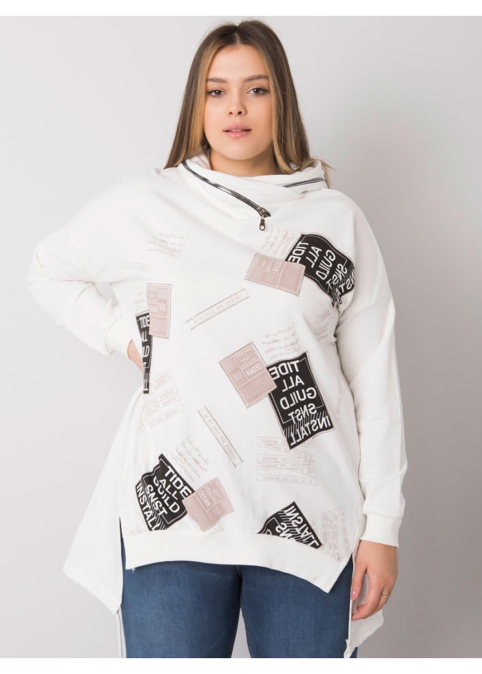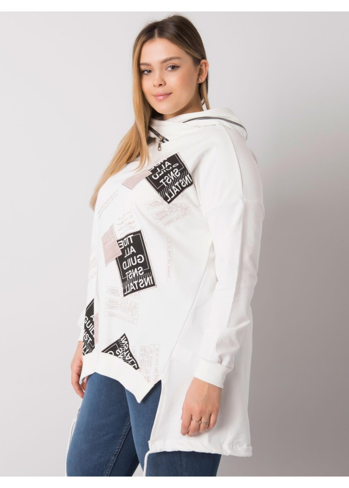 Asymetrická dámska mikina s kapucňou, šnúrka v zadnej časti, lémy na koncoch rukávov, ozdobná potlač, ozdobný zips na kapucni, ozdobné prešívanie, spôsob prania: pranie v práčke na 30°c, materiál: 90% bavlna, 10% elastan, univerzálna veľkosť, miery modelky: výška: 172 cm, prsia: 102 cm, pás: 77 cm, boky: 118 cm, rozmer produktu meraného na plocho:, šírka pod plecami: 65 cm, dĺžka rukáva: 63 cm, celková dĺžka: 84 cm.
