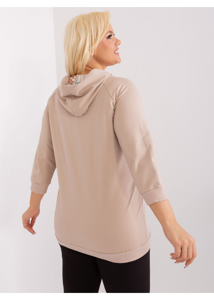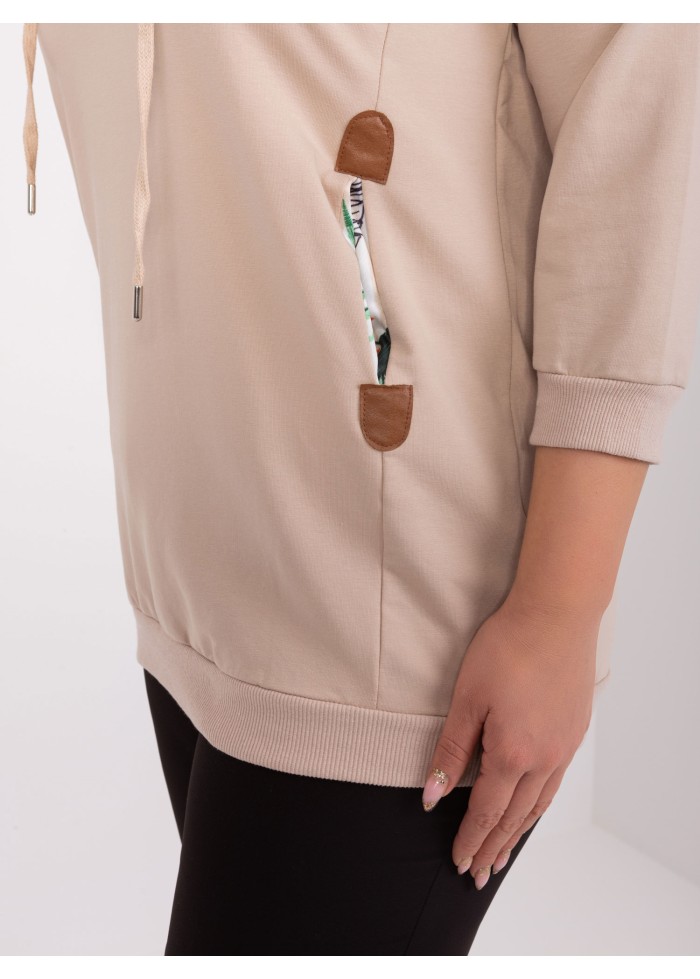 Dámska bavlnená mikina s kapucňou, ozdobné šnúrky na kapucni, kontrastná podšívka v kapucni, 3/4 rukávy, 2 bočné vrecká, koženkové aplikácie, lémy na konci rukávov, univerzálna veľkosť, miery modelky: výška 172 cm, prsia 103 cm, pás 73 cm, boky 103 cm., rozmer produktu meraného na plocho:, šírka pod plecami: 58 cm, dĺžka rukáva: 50 cm, celková dĺžka: 73 cm.