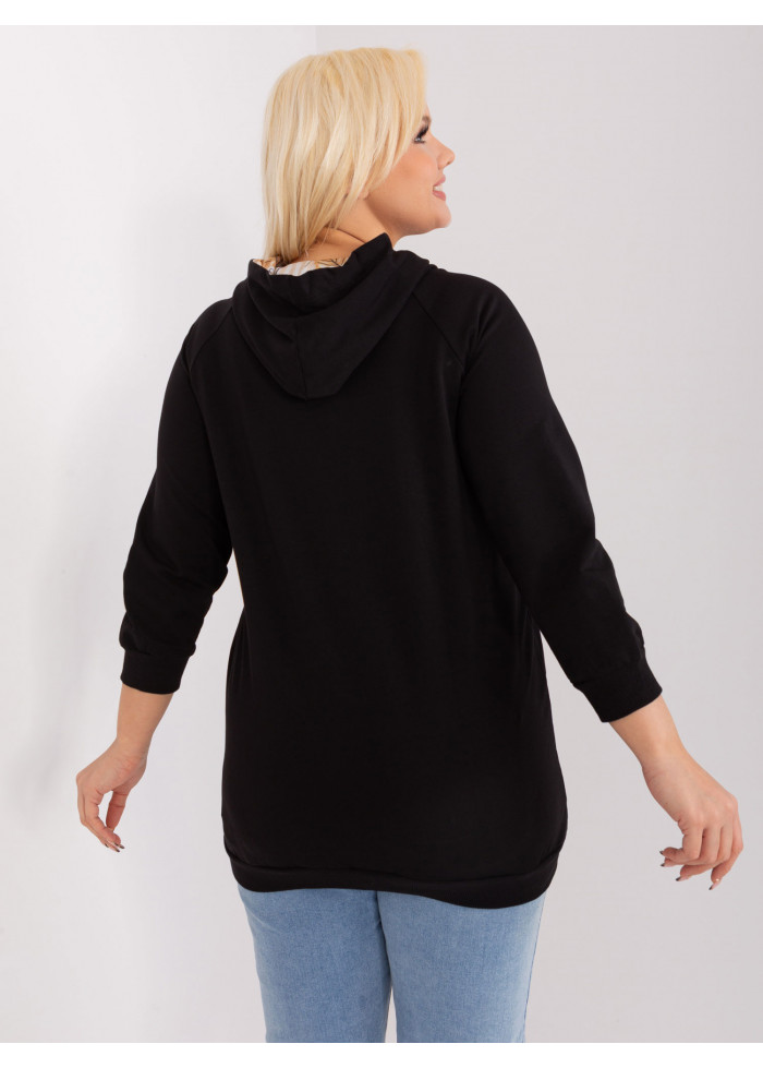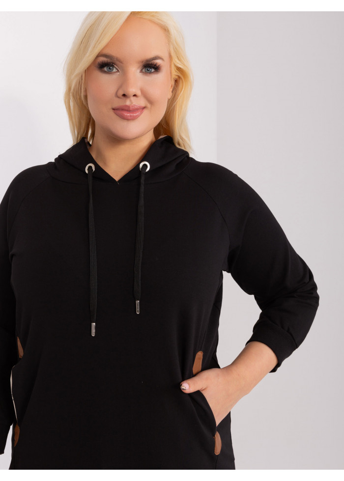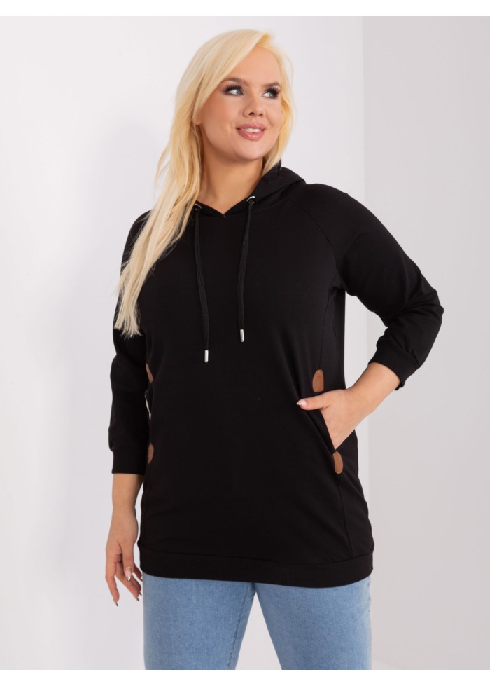 Dámska bavlnená mikina s kapucňou, ozdobné šnúrky na kapucni, kontrastná podšívka v kapucni, 3/4 rukávy, 2 bočné vrecká, koženkové aplikácie, lémy na konci rukávov, univerzálna veľkosť, miery modelky: výška 172 cm, prsia 103 cm, pás 73 cm, boky 103 cm., rozmer produktu meraného na plocho:, šírka pod plecami: 58 cm, dĺžka rukáva: 50 cm, celková dĺžka: 73 cm.