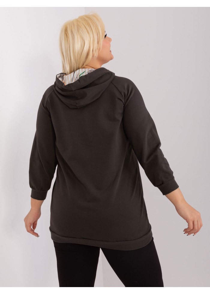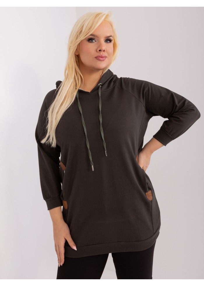 Dámska bavlnená mikina s kapucňou, ozdobné šnúrky na kapucni, kontrastná podšívka v kapucni, 3/4 rukávy, 2 bočné vrecká, koženkové aplikácie, lémy na konci rukávov, univerzálna veľkosť, miery modelky: výška 172 cm, prsia 103 cm, pás 73 cm, boky 103 cm., rozmer produktu meraného na plocho:, šírka pod plecami: 58 cm, dĺžka rukáva: 50 cm, celková dĺžka: 73 cm.