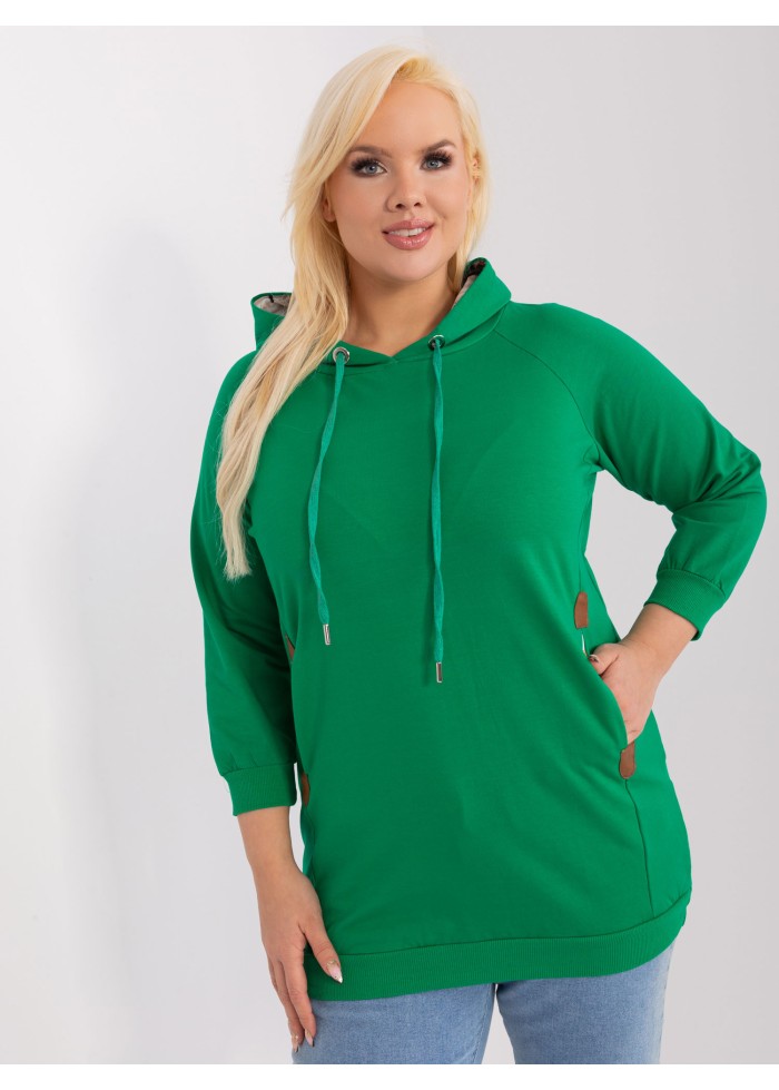 Dámska bavlnená mikina s kapucňou, ozdobné šnúrky na kapucni, kontrastná podšívka v kapucni, 3/4 rukávy, 2 bočné vrecká, koženkové aplikácie, lémy na konci rukávov, univerzálna veľkosť, miery modelky: výška 172 cm, prsia 103 cm, pás 73 cm, boky 103 cm., rozmer produktu meraného na plocho:, šírka pod plecami: 58 cm, dĺžka rukáva: 50 cm, celková dĺžka: 73 cm.
